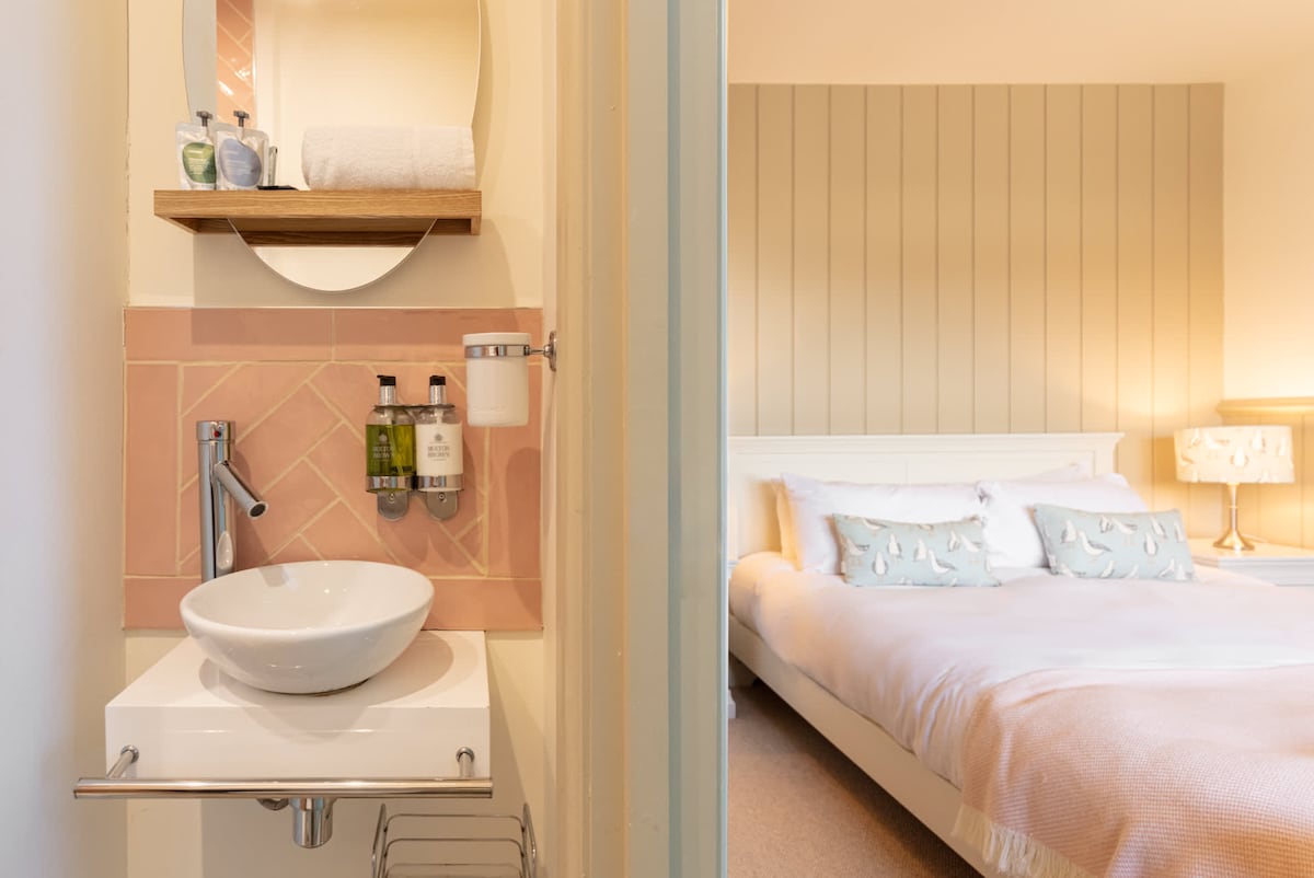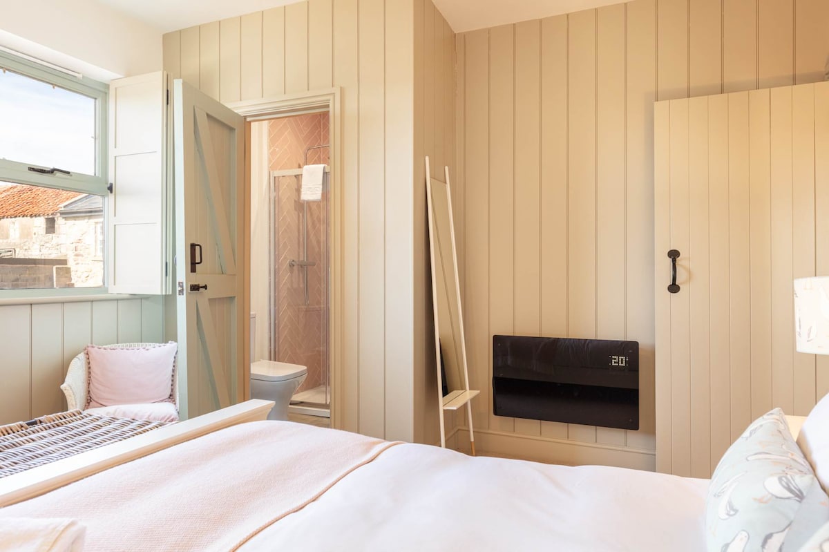 Head upstairs and you’ll find The Old Smokey’s two bedrooms. Fully carpeted, the first bedroom boasts a king-size bed along with hanging space for your clothing. The calming interiors are perfectly complemented by the subtle touch of pink hues from the soft furnishings, creating a warm and cosy ambience.