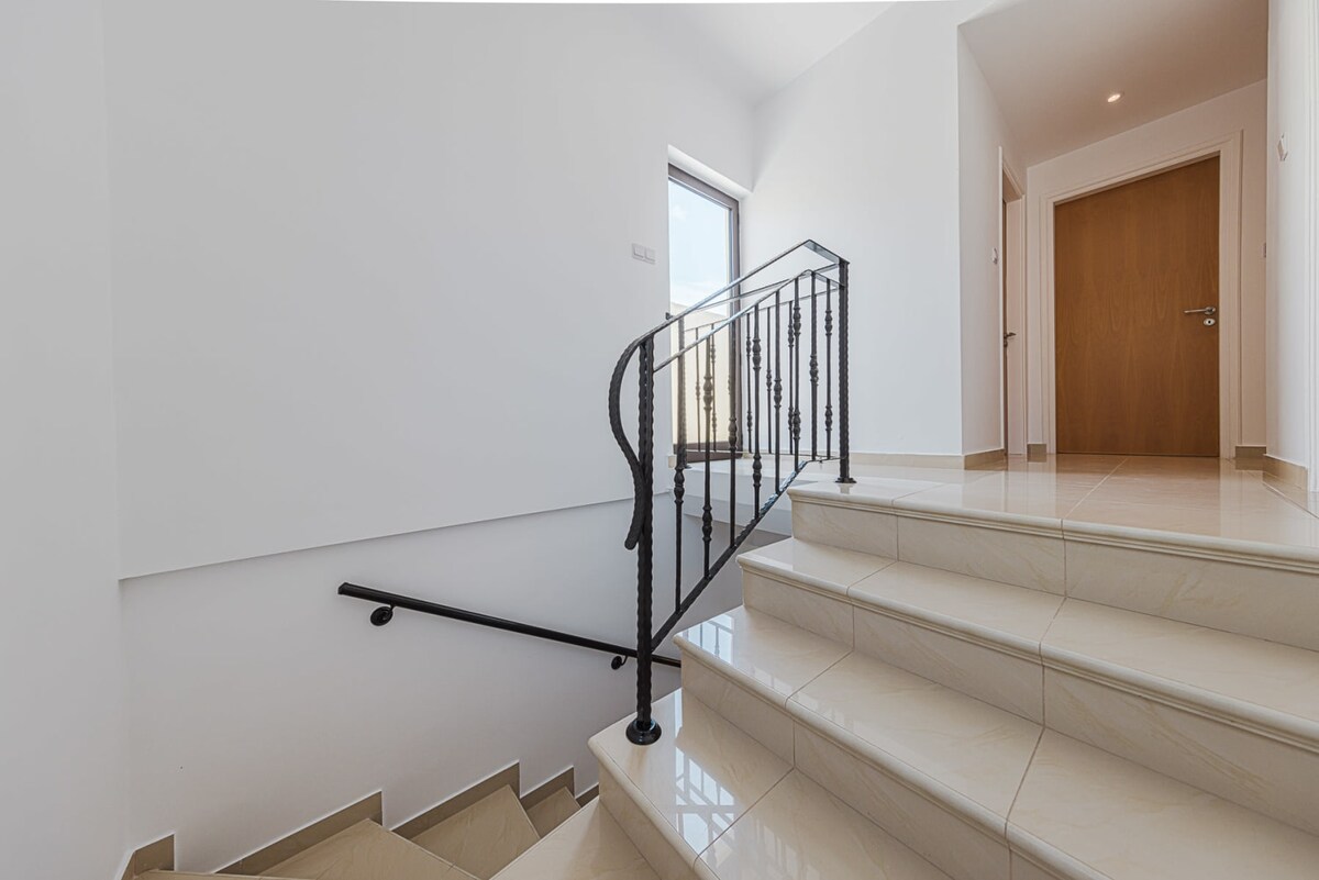 Modern and clean, the family bathroom features a bathtub with an overhead shower, WC and basin. An ensuite is also attached to one of the king bedrooms and this space is home to a shower, wash basin and WC. An additional WC can also be found on the ground floor.