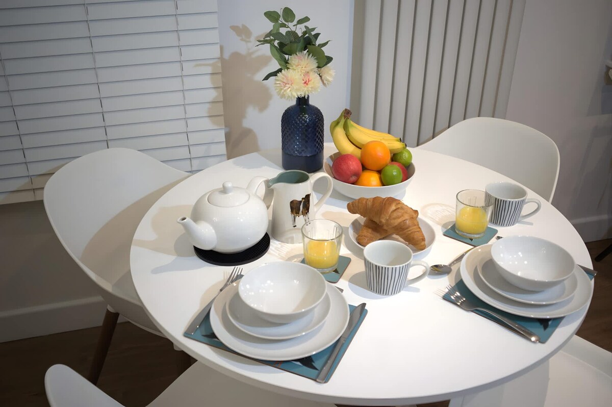 The dining area comes in the form of a round white table and four matching chairs. Whether you’ve prepared a home cooked meal or enjoy a takeaway, this space is perfect for dining during your visit.