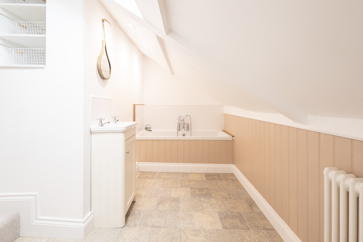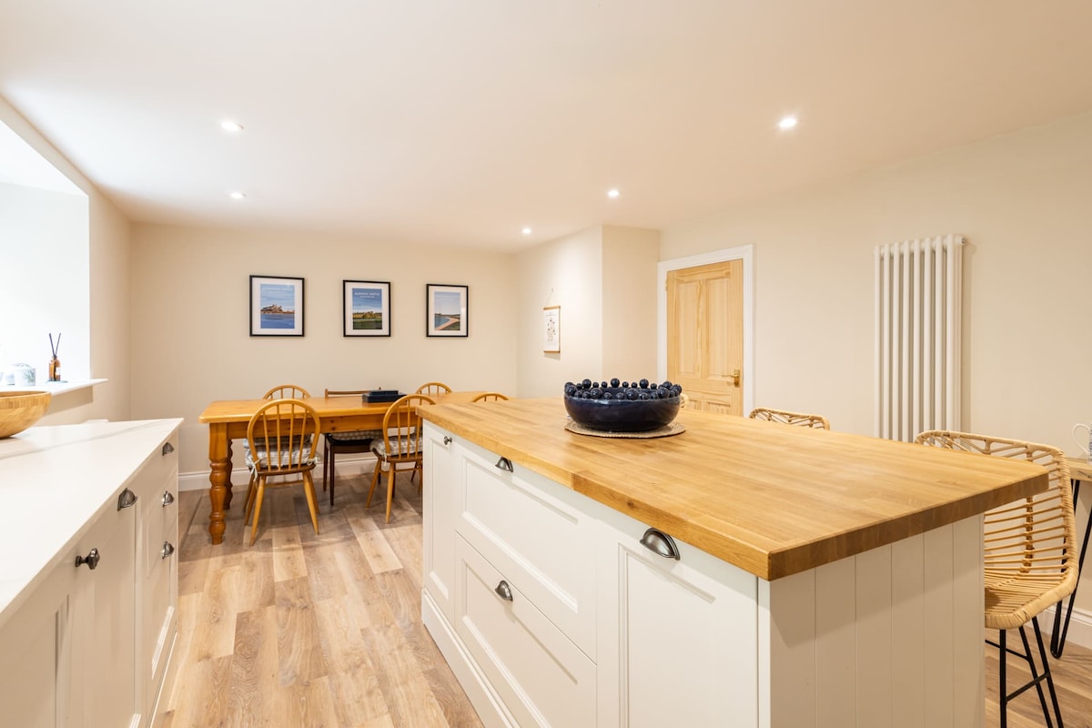 The modern and spacious kitchen is fully equipped with everything you could need for a self-catering stay. The breakfast bar with wicker seating creates a lovely space for social cooking. Sharing the kitchen space is a large dining area with a traditional wooden table and matching chairs. Open the doors from the adjoining utility area and let the fresh Northumberland air flood in, whilst you enjoy home cooked meals with your guests.
