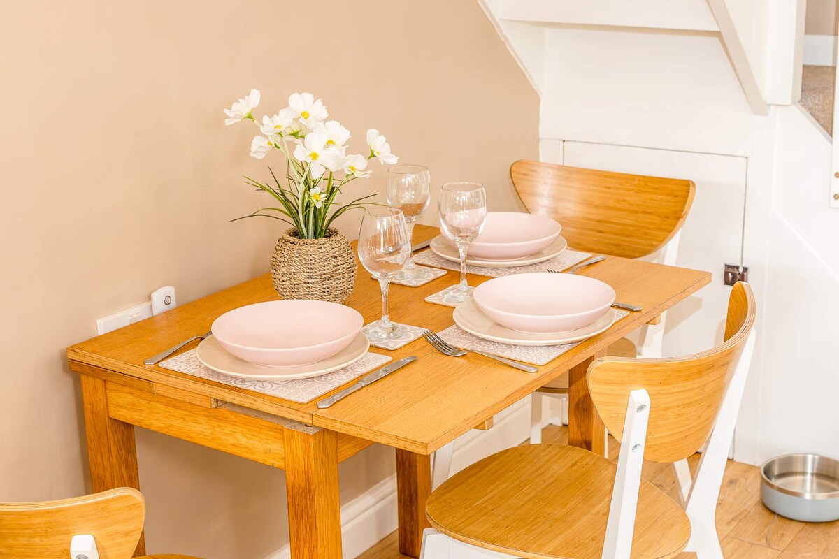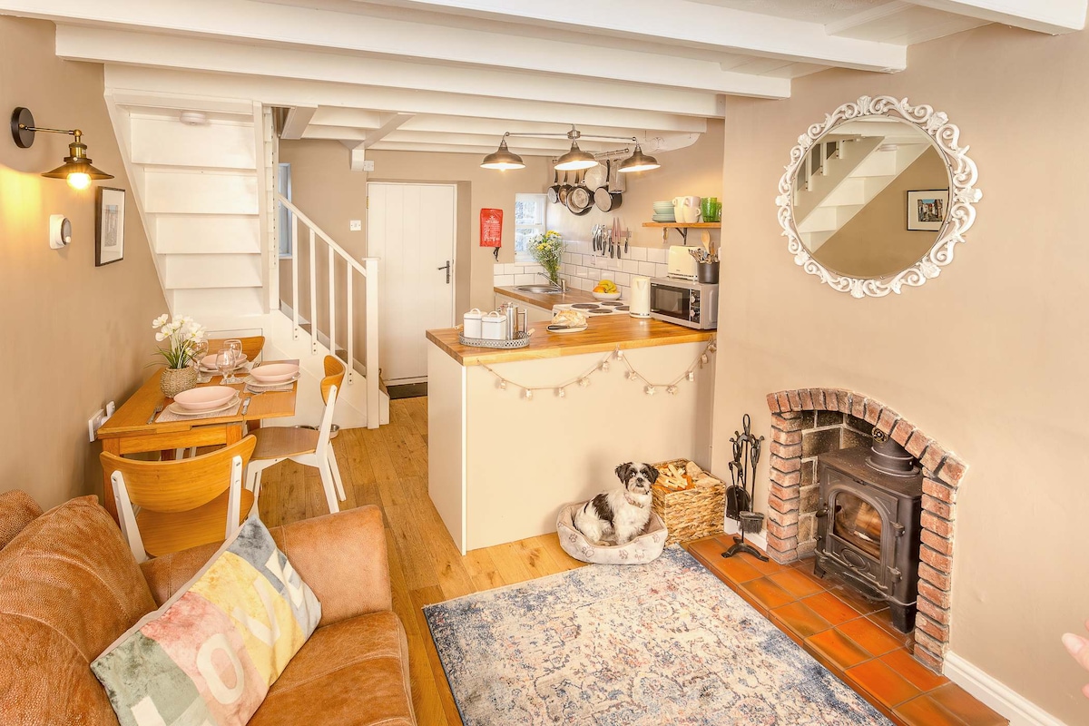 Honey Cottage has a welcoming open-plan living, kitchen and dining room. With exposed beams, a bay window and a traditional fireplace, you'll find plenty of character throughout the space.Cosy and homely, the living area features a leather sofa and an armchair. The perfect spot to enjoy a quiet night in, you can turn on the flat screen TV to watch streaming services and snuggle up with your loved ones.