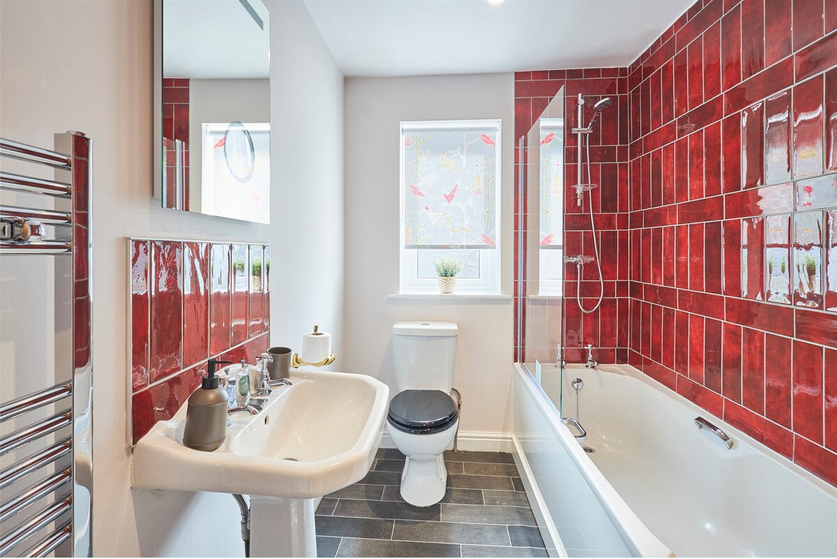 A clean family bathroom is on the same floor as the bedrooms and is fitted with a WC, a wash basin and a bathtub with an overhead shower.