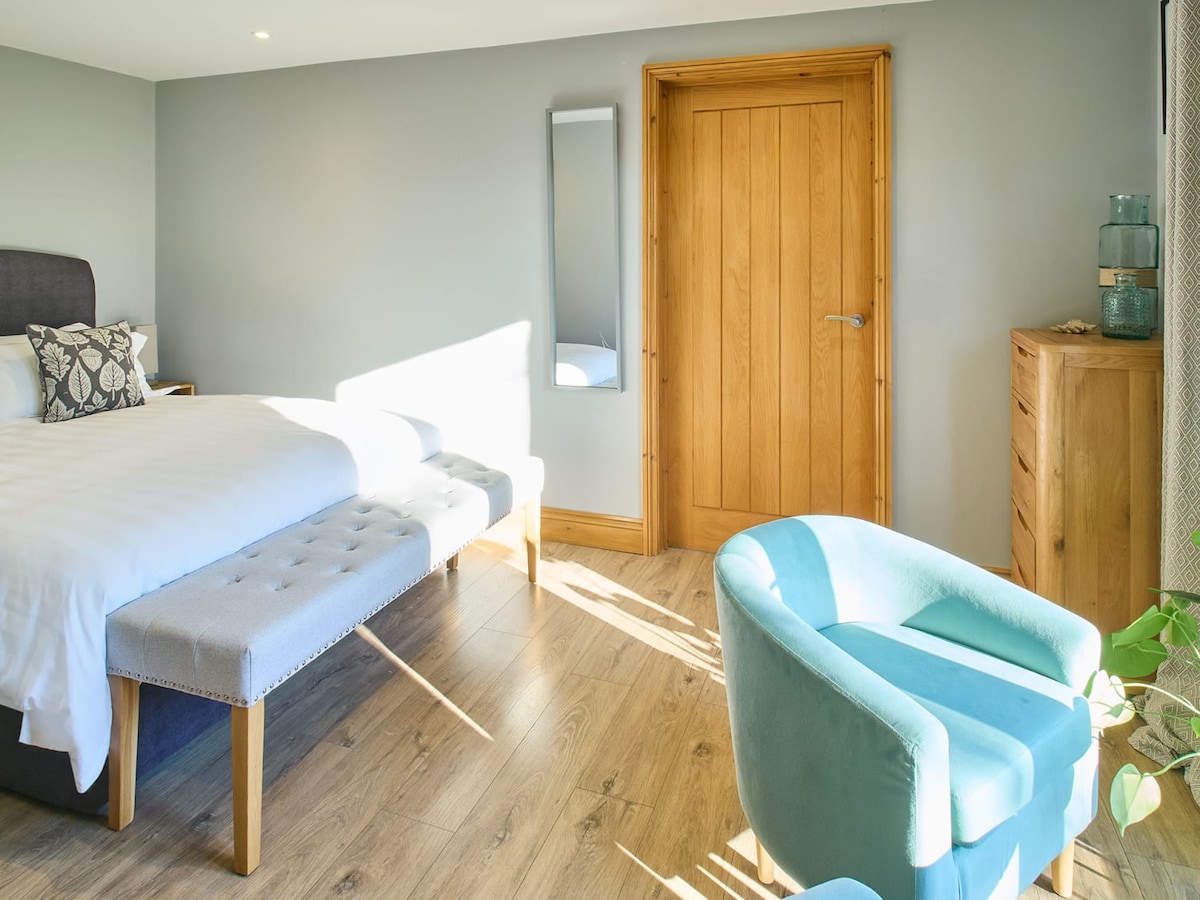 The bedroom is spacious and has a king size bed with a wardrobe, dressing table, bedside tables and lamps. Two tub chairs and a coffee table are the perfect place to enjoy a morning coffee looking through the patio doors onto the orchard.