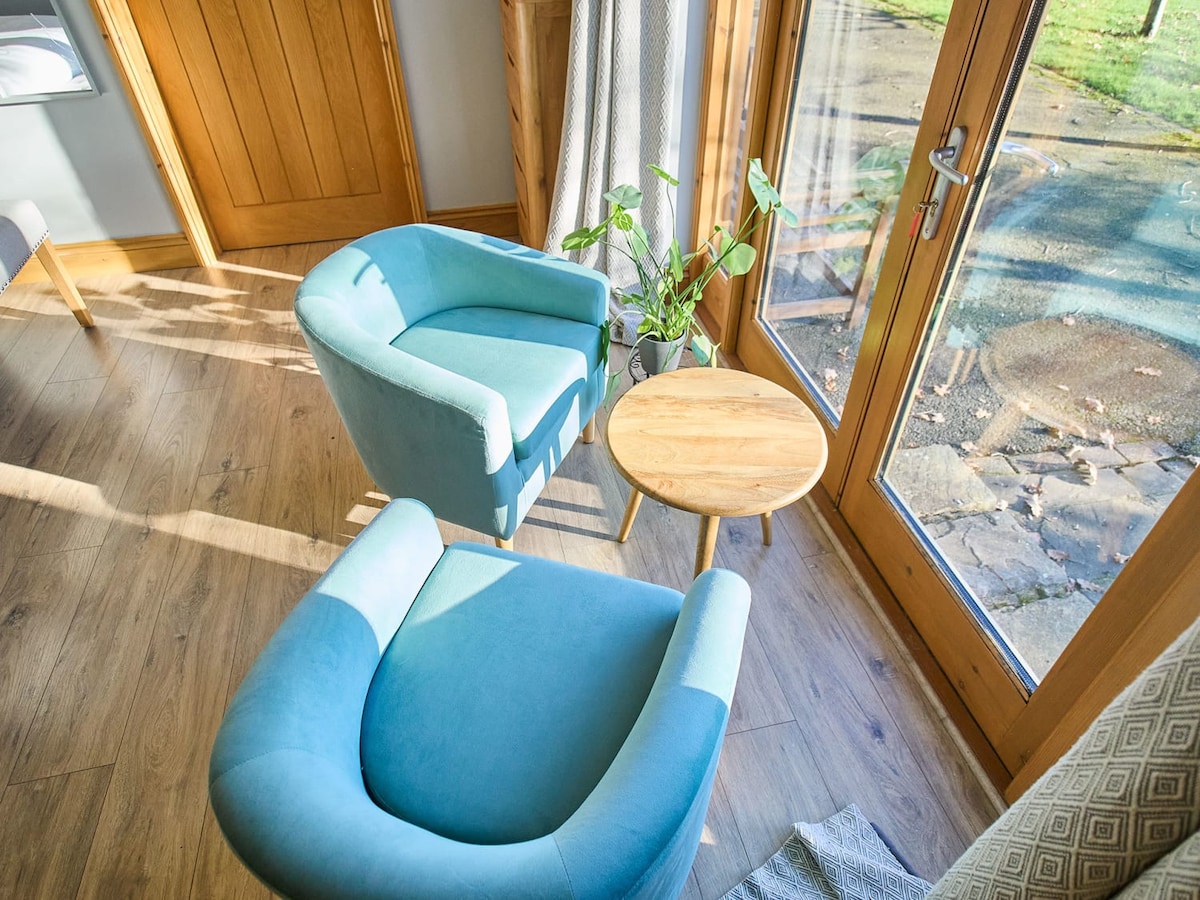 Orchard Barn offers a spacious open plan living area with underfloor heating throughout and wood effect flooring with rugs. In the living area there is a Smart TV, a coffee table, and two comfortable sofas, one of which is a sofa bed which can be made up upon request to increase the occupancy to four. You’ll also find an armchair to relax in and enjoy a good book, while patio doors look out and open up onto the orchard. There is also a large desk for those who wish to catch up with any work.The kitchen is fully equipped and has a dishwasher, microwave and washing machine. There is an electric oven with a four-ring induction hob and a fridge with a small freezer compartment.