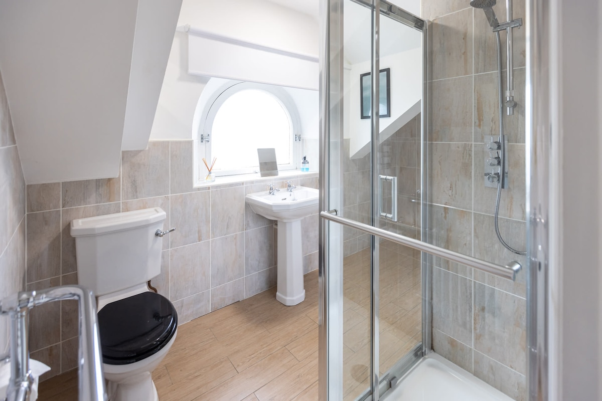 The family bathroom offers a bathtub with separate shower, WC and basin, while the ensuite is home to a walk-in shower. On the ground floor, there is a third bathroom which acts as a wet room.