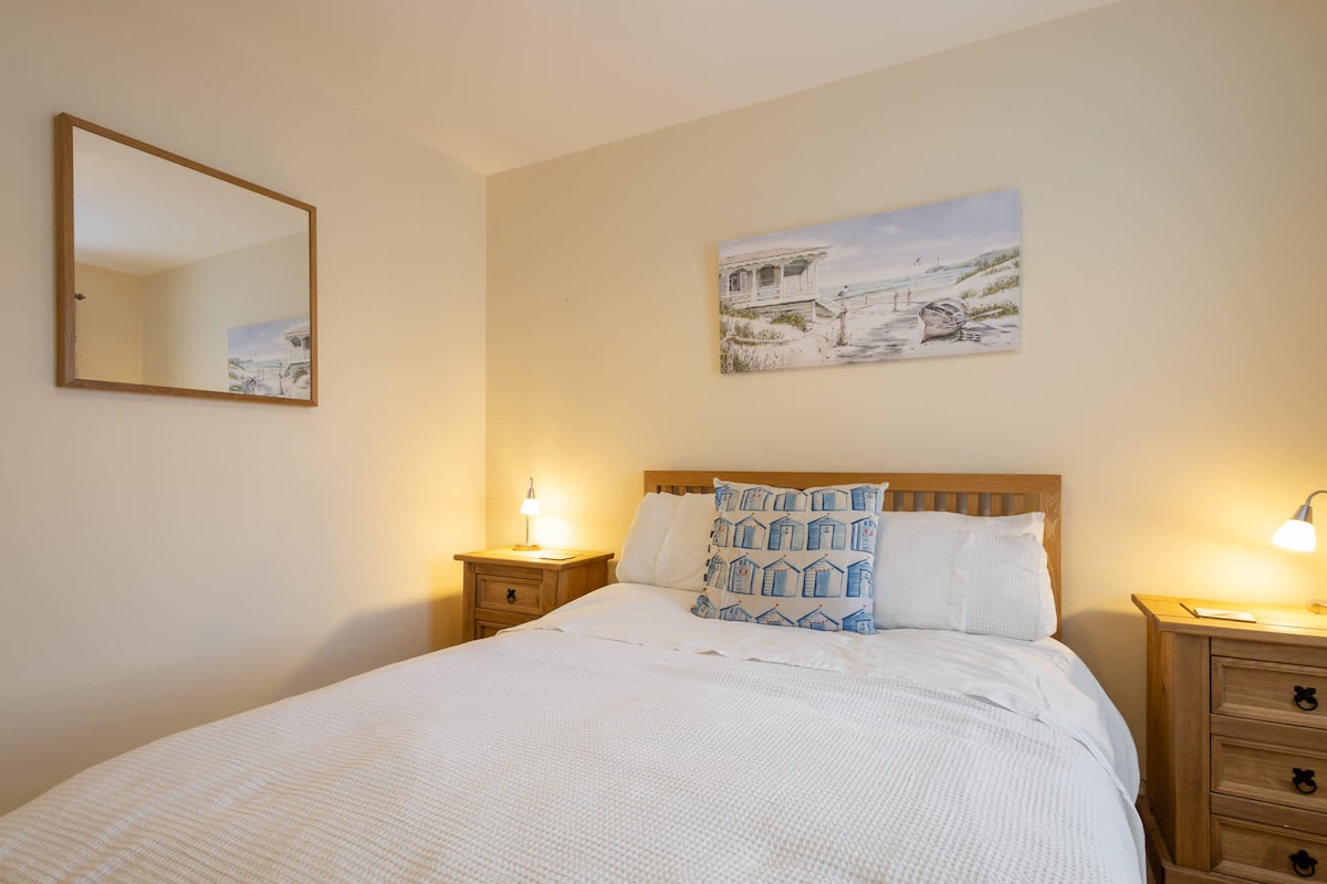 The master bedroom features a double bed with blue soft furnishings. The second bedroom offers a twin bed, ideal for children and solo members of your party. Both bedrooms are bright and airy with windows and white interiors. There is a cupboard in the hallway which acts as a wardrobe. Hangers are supplied.