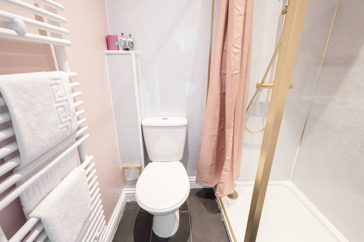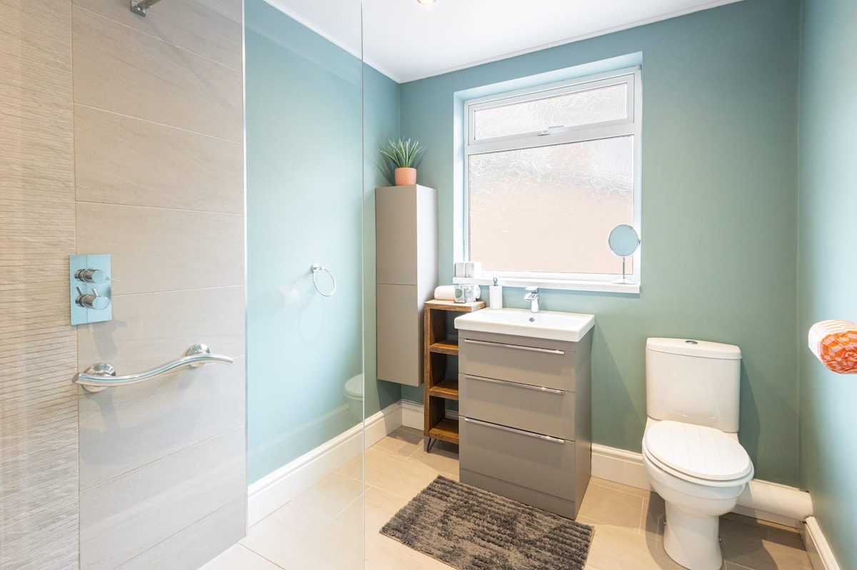 Both bathrooms are sparkling clean with light and fresh interiors. Both spaces are fitted with walk-in showers, WCs, and wash basins. A separate WC is also available next door to the first-floor bathroom.