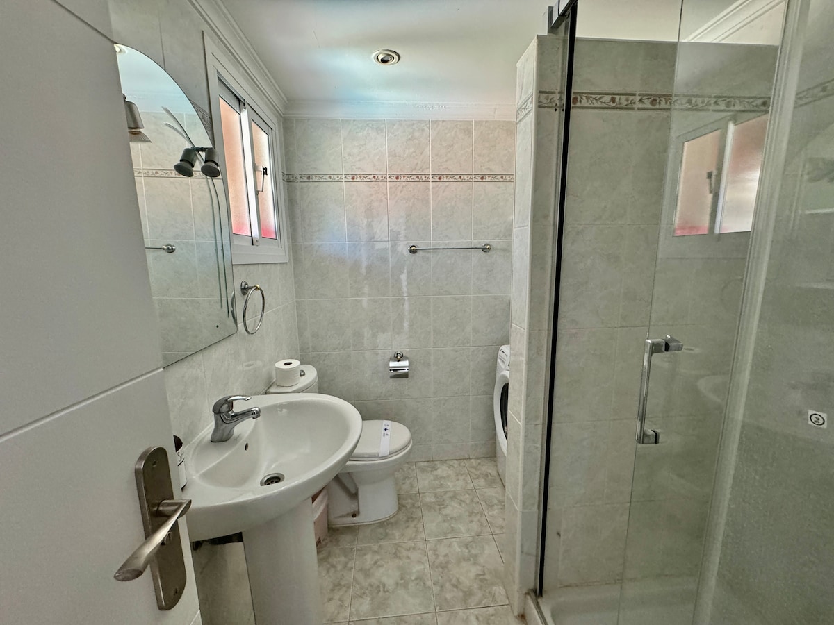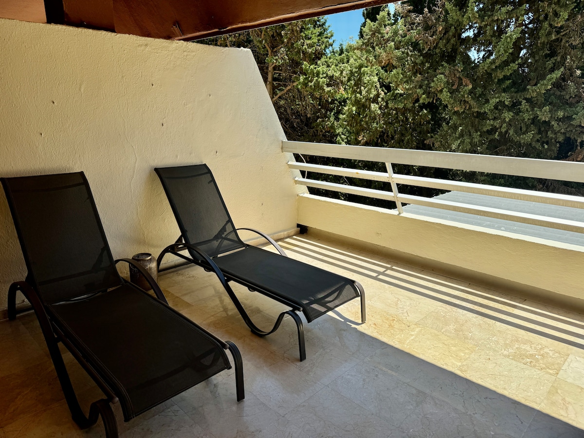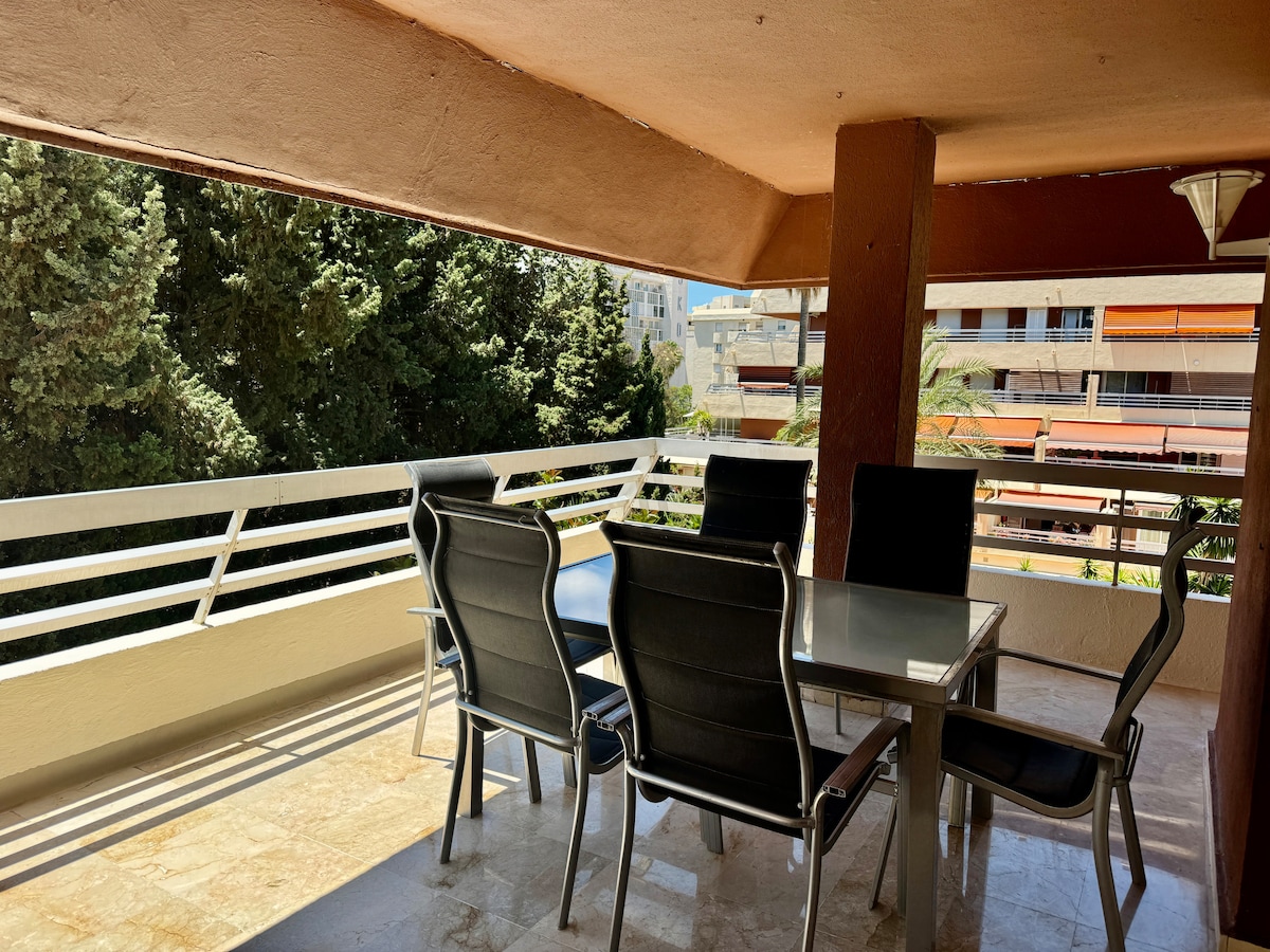 Great apartment in the centre of Marbella. Hosts are great, was easy to leave our luggage when we arrived early! Beautiful well laid out apartment with great terrace. Open plan kitchen and lounge leading onto the terrace with 6 place table and two sun loungers :) Terrace overlooks the swimming pools and the park. The three bedrooms were good size and clean and with three bathrooms it makes life easy. We really enjoyed our time here and bet you will as well.
