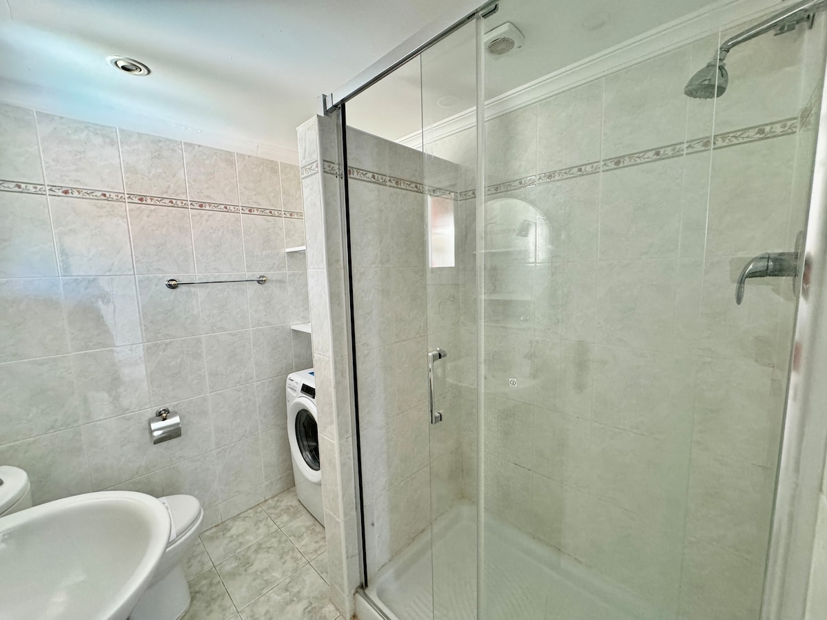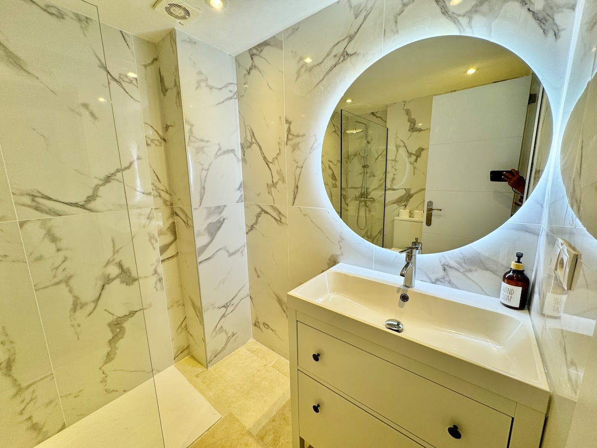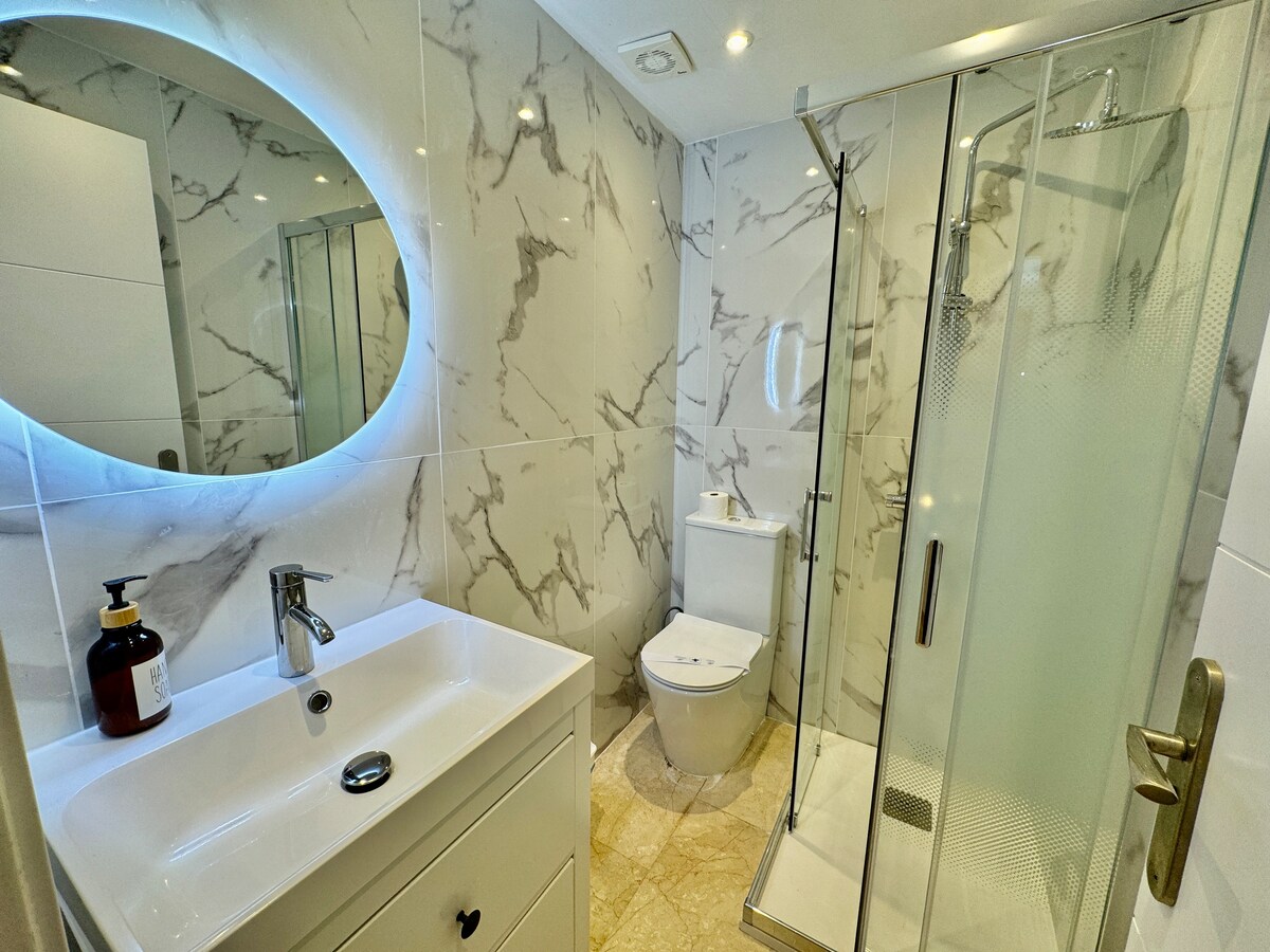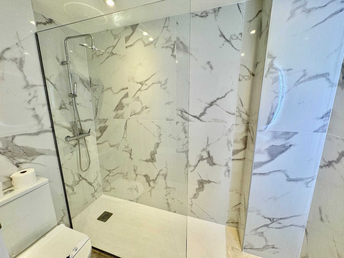 Great apartment in the centre of Marbella. Hosts are great, was easy to leave our luggage when we arrived early! Beautiful well laid out apartment with great terrace. Open plan kitchen and lounge leading onto the terrace with 6 place table and two sun loungers :) Terrace overlooks the swimming pools and the park. The three bedrooms were good size and clean and with three bathrooms it makes life easy. We really enjoyed our time here and bet you will as well.
