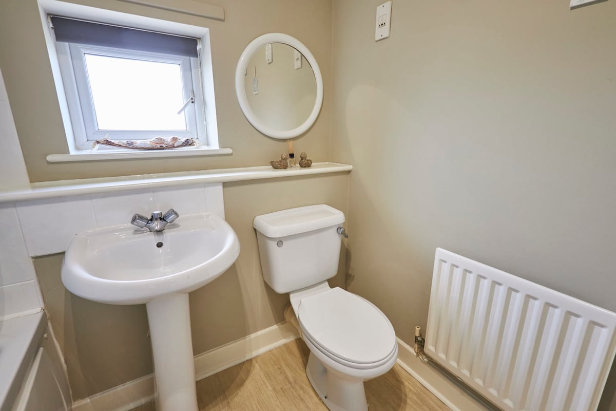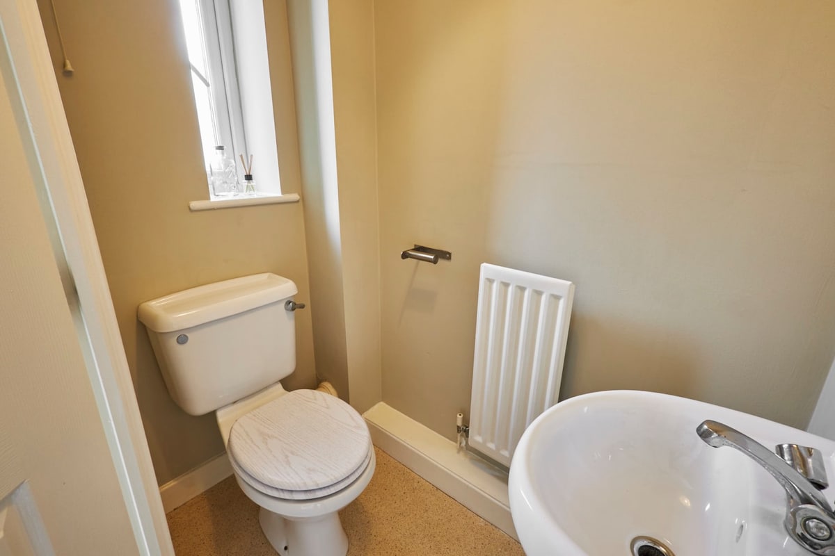 The family bathroom features a bathtub with an overhead shower, WC and basin. You’ll also find a separate WC on the ground floor.