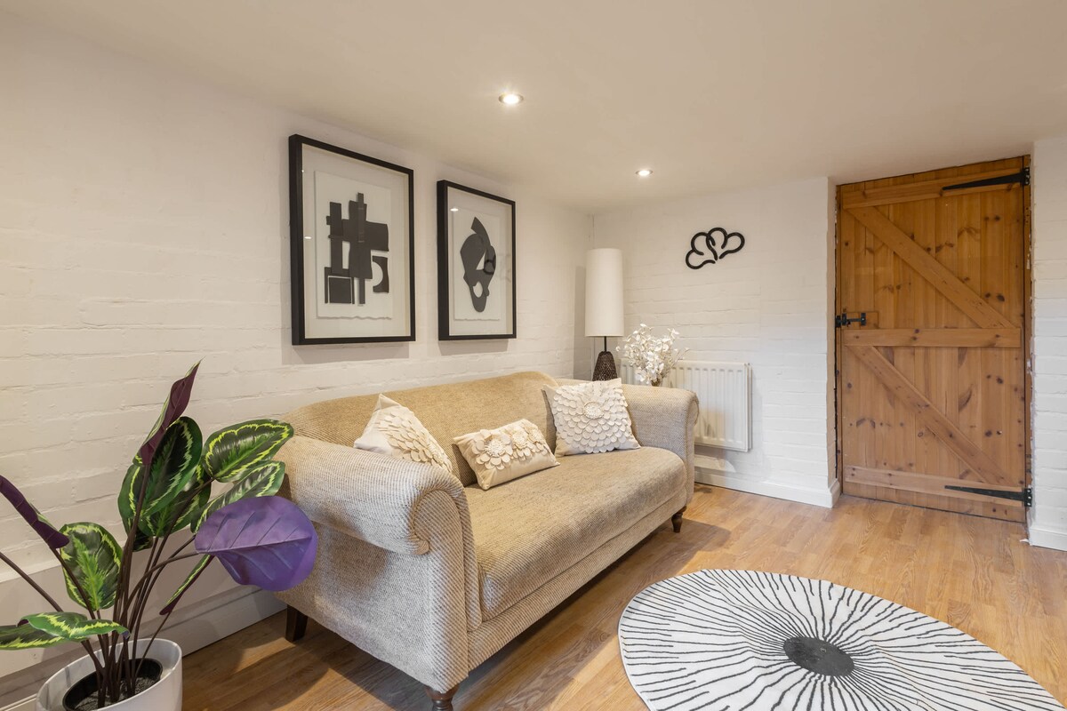 As you walk in from the entrance, you will find the first living room and a utility area on the lower floor. Home to a sofa, white piano, and doors opening out into the garden, this space is a wonderful bonus to Yule House.