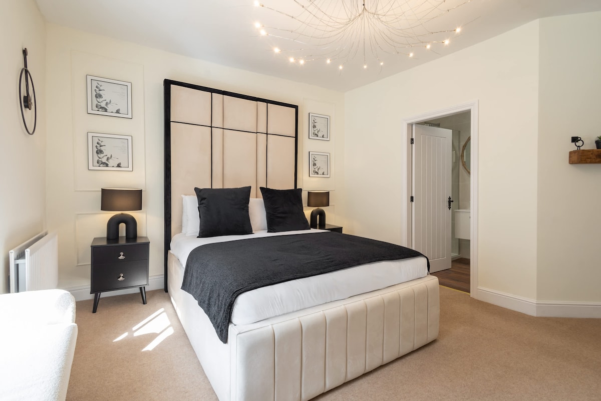 The room next to the main bathroom is the first bedroom - Castle View. Featuring a double bed, bedside tables and lamps, this space has everything you could need for a comfortable stay.