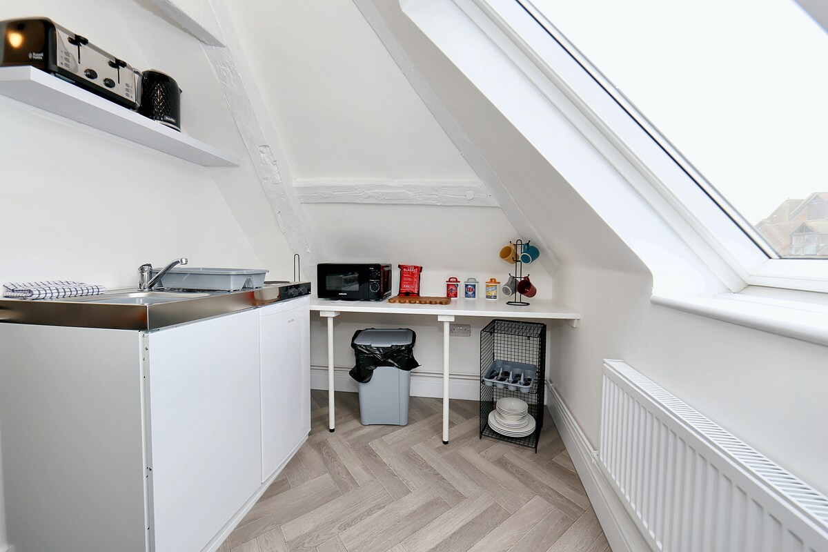 The kitchen area comes well equipped. There is a fridge/freezer, oven, washing machine, microwave, kettle and toaster. There is also a sleek dining area with chairs.