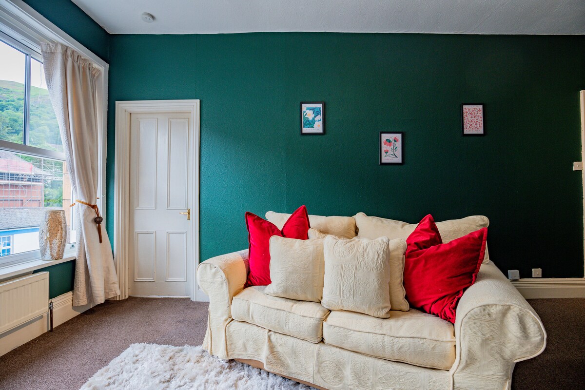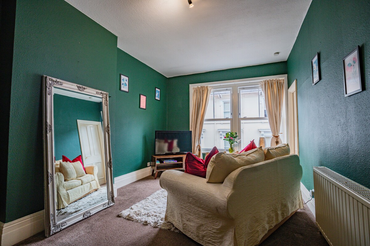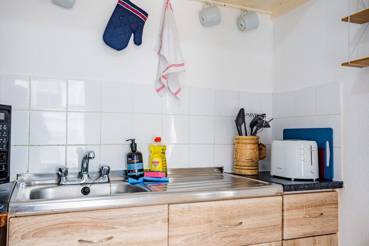 The open-plan living area is thoughtfully designed to make the most of the space, with a comfortable lounge area for relaxation and a fully equipped kitchen for preparing meals. Large windows flood the apartment with natural light, creating a bright and airy atmosphere. Whether you’re cooking a meal, enjoying a cup of tea, or unwinding after a day of exploring, Broadbanks Apartment provides everything you need for a relaxing stay.