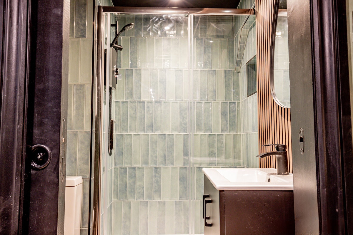 The luxurious bathroom includes a walk-in shower, toilet, and sink, along with towels, soap, and toilet paper provided for your convenience.