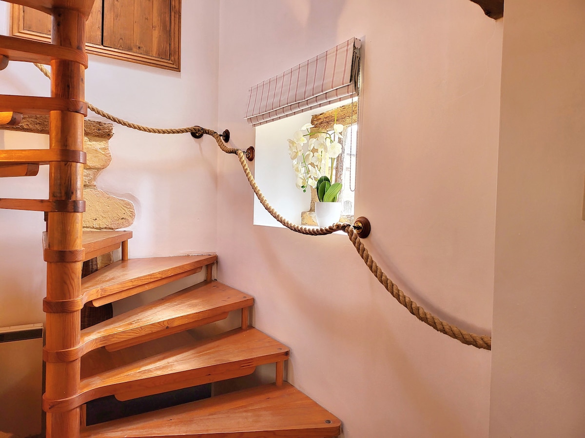 Winding wooden stairs with rope rail, lead up from the lounge area to the first floor landing, off which are the following rooms: