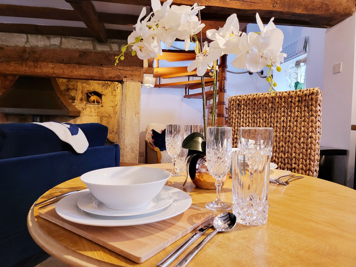 Gwenelin Cottage is a midterraced Cotswold stone cottage situated within beautiful twin courtyards. The cottage entrance opens into a modernised but traditional feel open plan kitchen and living space, with original flagstone floor throughout. Enjoy a coffee at the kitchen table or snuggle into the sofa in the lounge area. Perhaps get cosy reading a book or two in the reading nook which awaits you next to the original inglenook fireplace.Please be aware that this property is located near a main B-road. You may hear noise from passing cars at peak times. The cottage has all the original features including the windows that are only single pane.