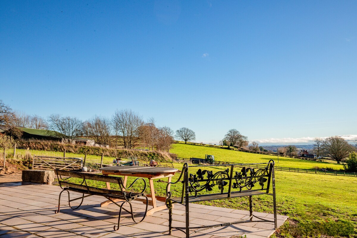 Outside, the property features a large garden with stunning countryside views, offering plenty of space for outdoor seating and relaxation.