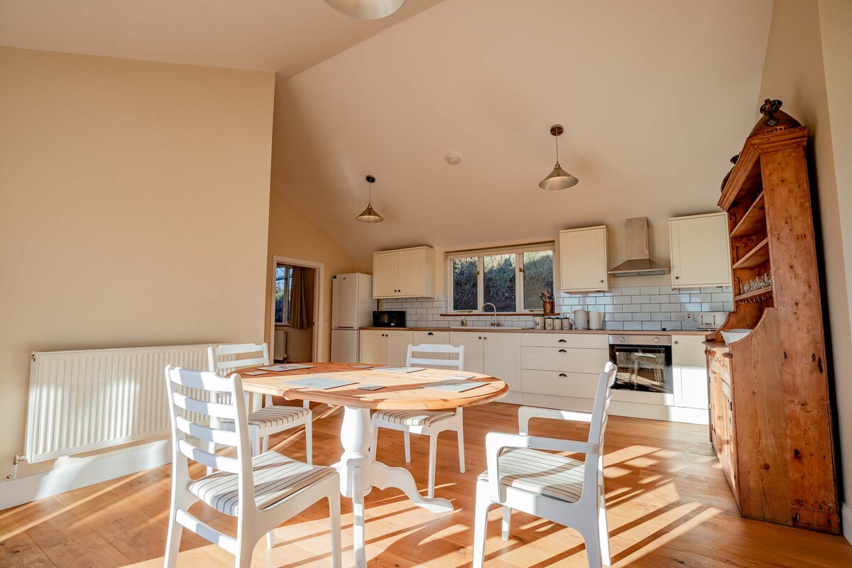 As you enter this bright and cosy barn, you're immediately welcomed into the open-plan living room. The living area is connected to the dining room and kitchen, featuring a beautiful brown leather two-seater sofa, an armchair, and a TV for evening entertainment. High ceilings and large windows allow natural light to flood the space, creating a warm and inviting atmosphere. The fully equipped kitchen has everything you need for a self-catering stay, ensuring convenience and comfort throughout your visit.Bedroom 1, located just behind the kitchen and dining area, offers a spacious double bed, two bedside tables, a wardrobe, and its own en-suite bathroom. Bedroom 2, situated behind the first bedroom, also includes two bedside tables, a wardrobe, and an en-suite. There’s an additional WC to the right as you walk into the barn, complete with a toilet and sink (with toilet paper and soap provided).