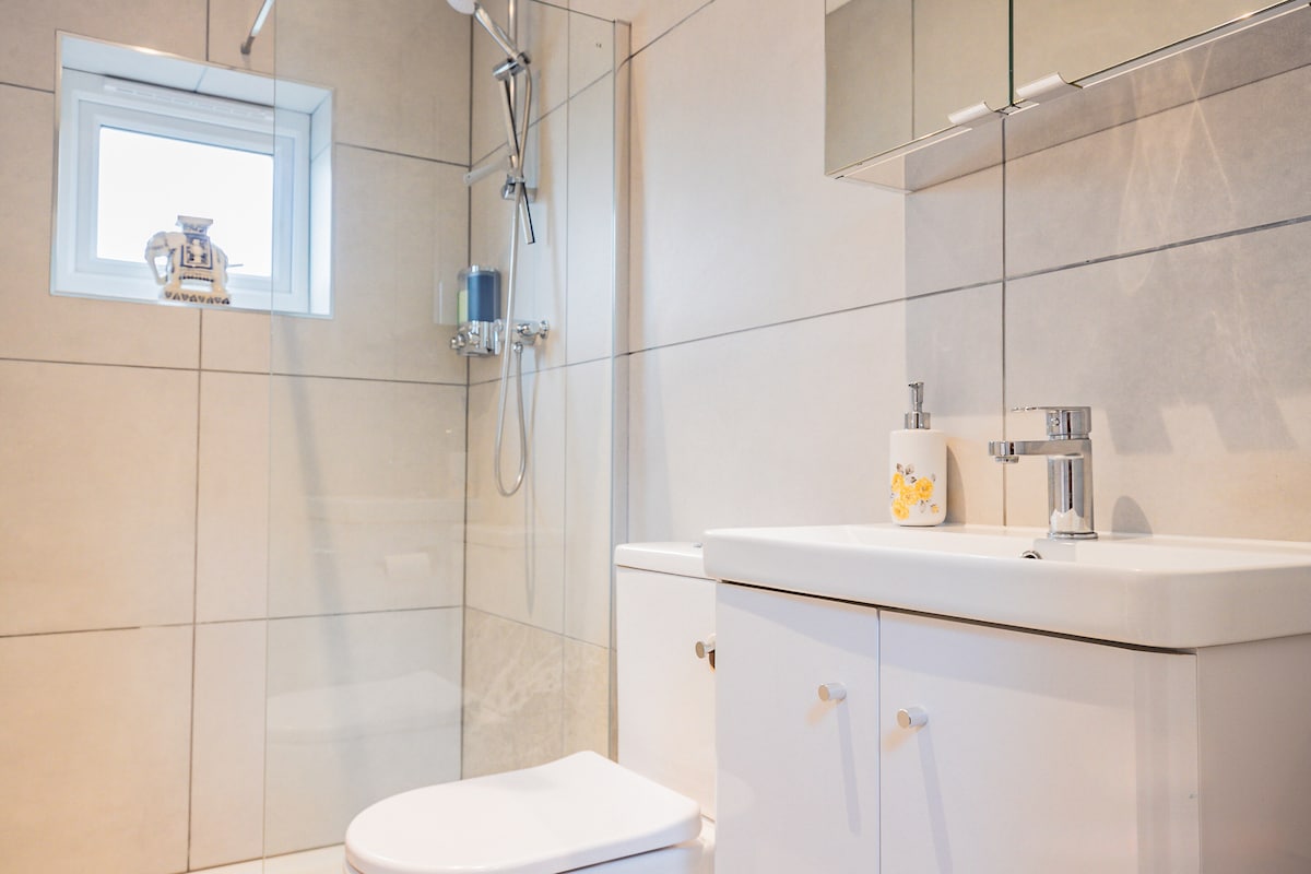 The bathroom is equipped with a walk-in shower, sink, and toilet, with towels provided for your stay. With its cosy living spaces and thoughtful amenities, Little Highlands is the perfect countryside retreat.