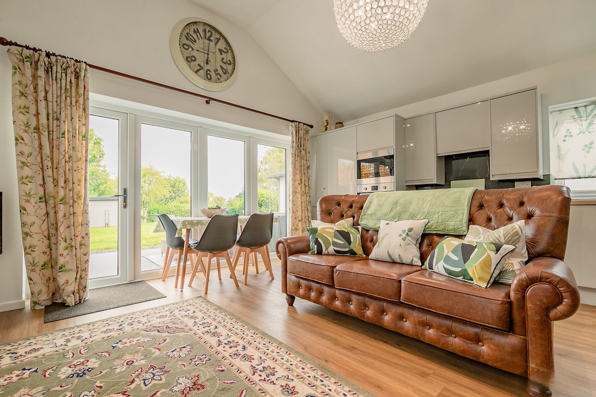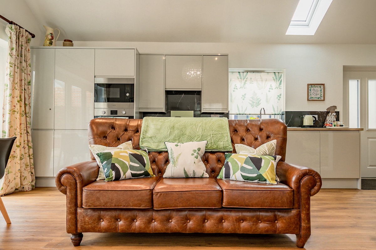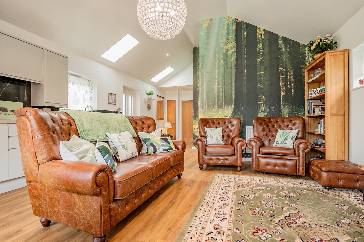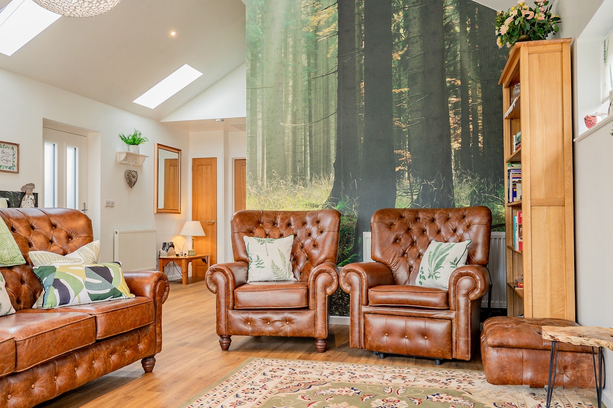 At Little Highlands, you'll find a fully-equipped modern kitchen with everything you need to create culinary delights. The kitchen includes appliances such as a hob, oven, large fridge/freezer, microwave, toaster, and more. The dining area, located within the kitchen, offers a bright and welcoming space to enjoy evening meals, with a lovely view of the garden.The spacious living area is the perfect spot to unwind, featuring a large sofa and two comfy armchairs by a bookshelf—ideal for settling in with a good book while enjoying the garden views. For entertainment, there’s also a Smart TV available.