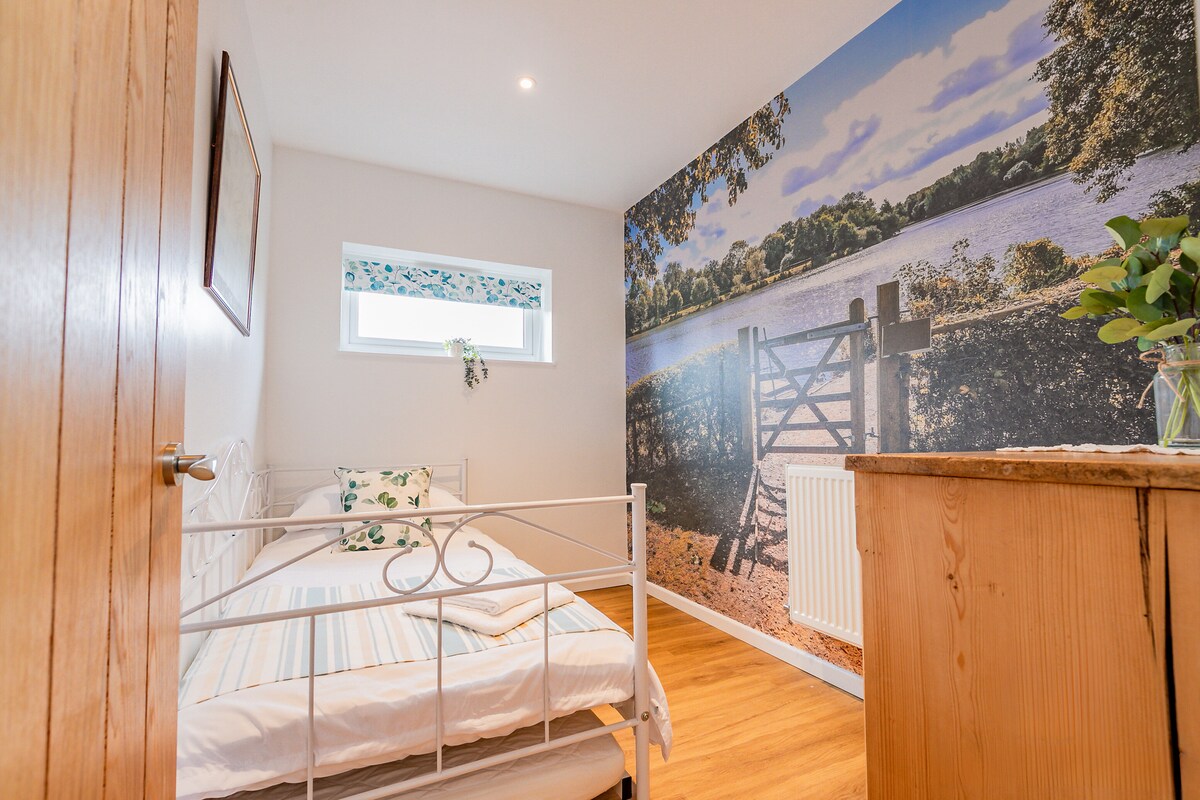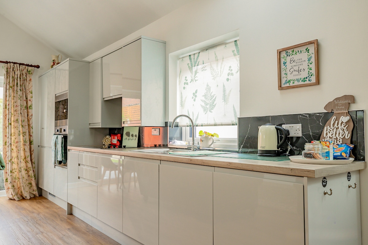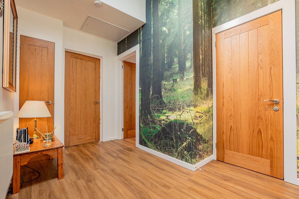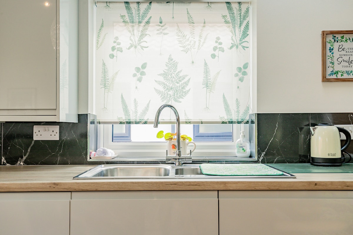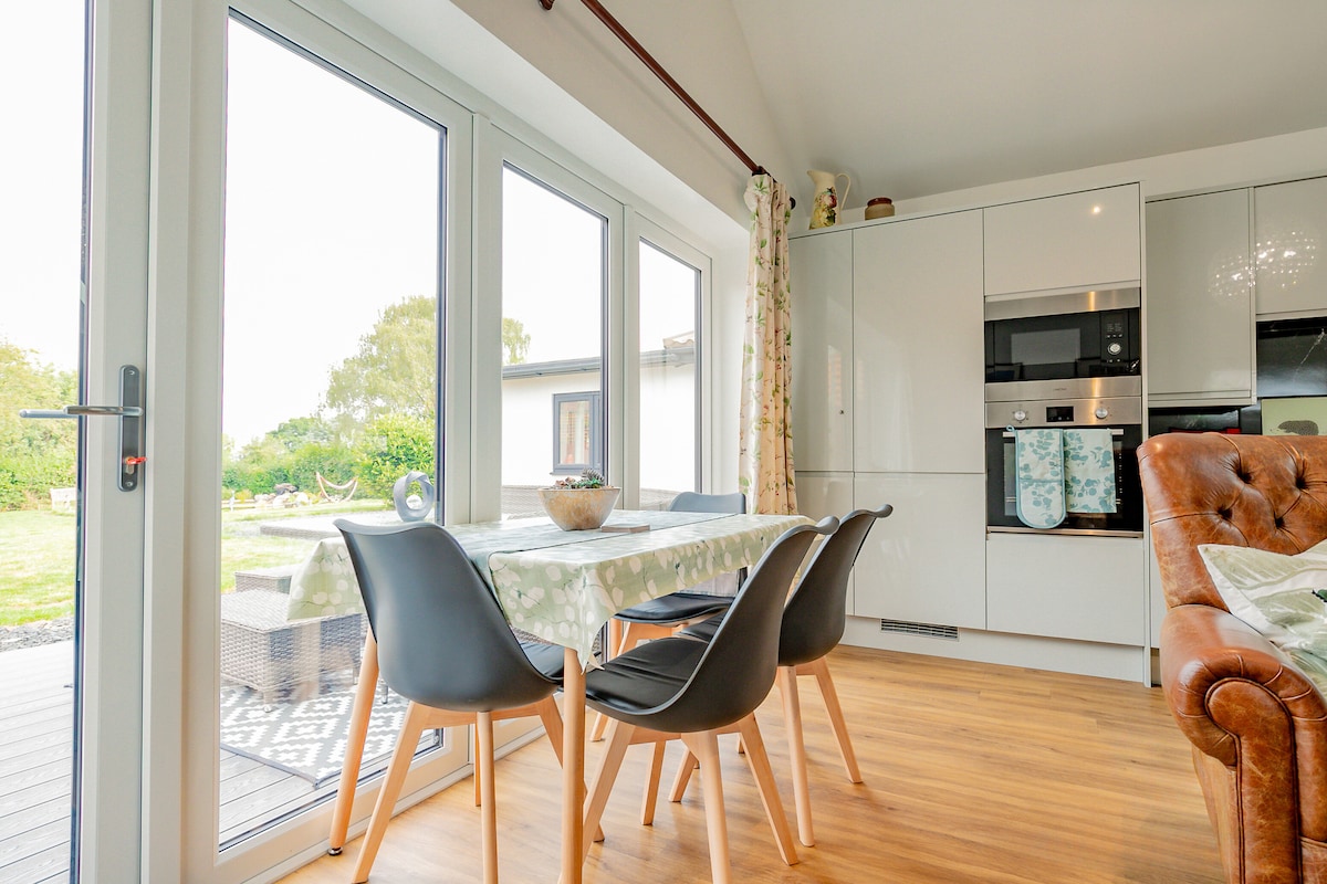 At Little Highlands, you'll find a fully-equipped modern kitchen with everything you need to create culinary delights. The kitchen includes appliances such as a hob, oven, large fridge/freezer, microwave, toaster, and more. The dining area, located within the kitchen, offers a bright and welcoming space to enjoy evening meals, with a lovely view of the garden.The spacious living area is the perfect spot to unwind, featuring a large sofa and two comfy armchairs by a bookshelf—ideal for settling in with a good book while enjoying the garden views. For entertainment, there’s also a Smart TV available.