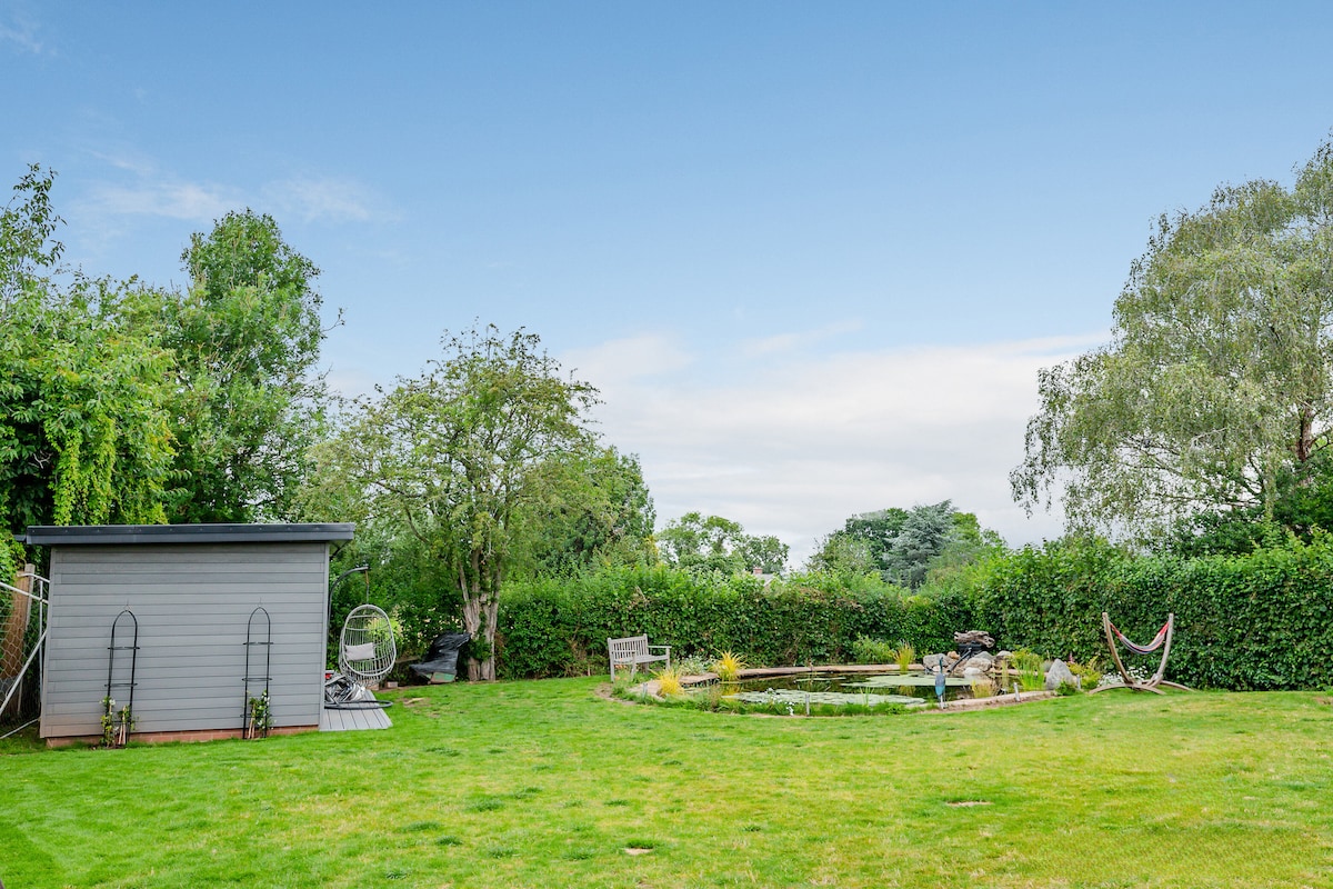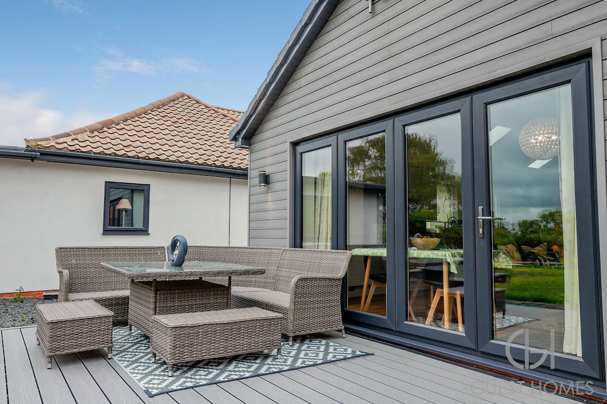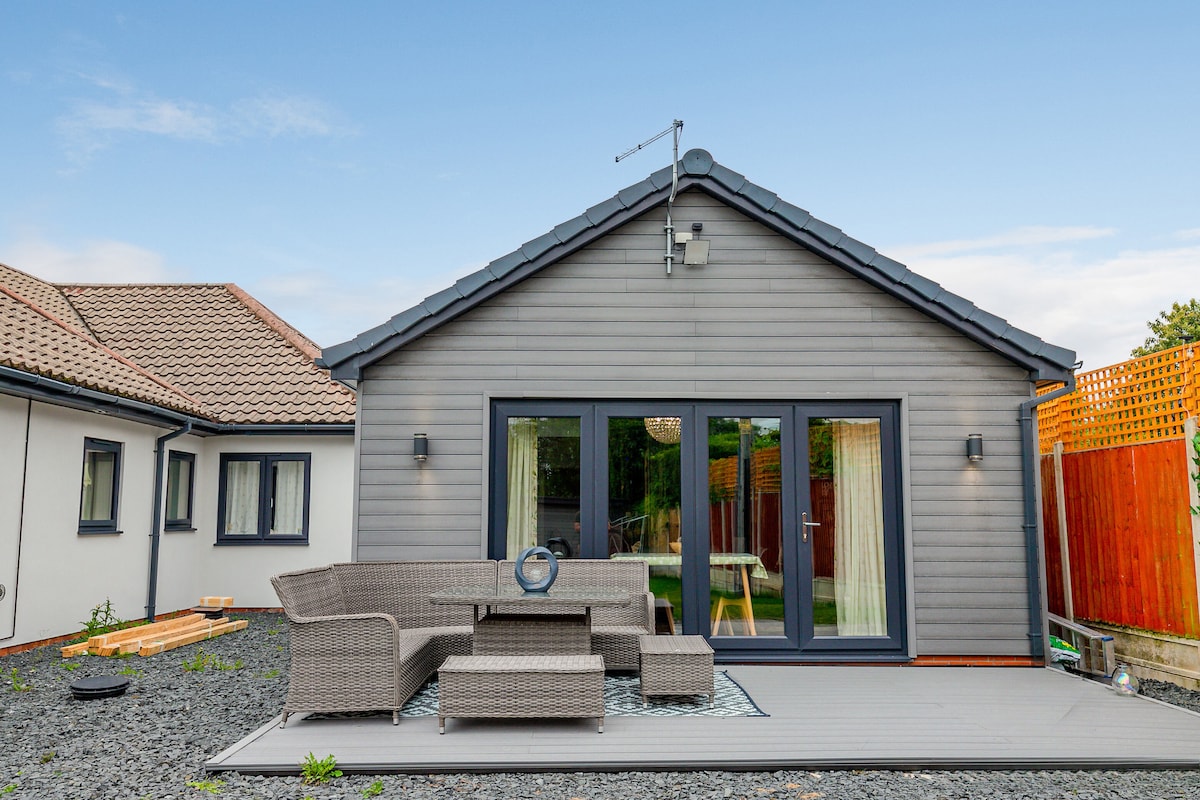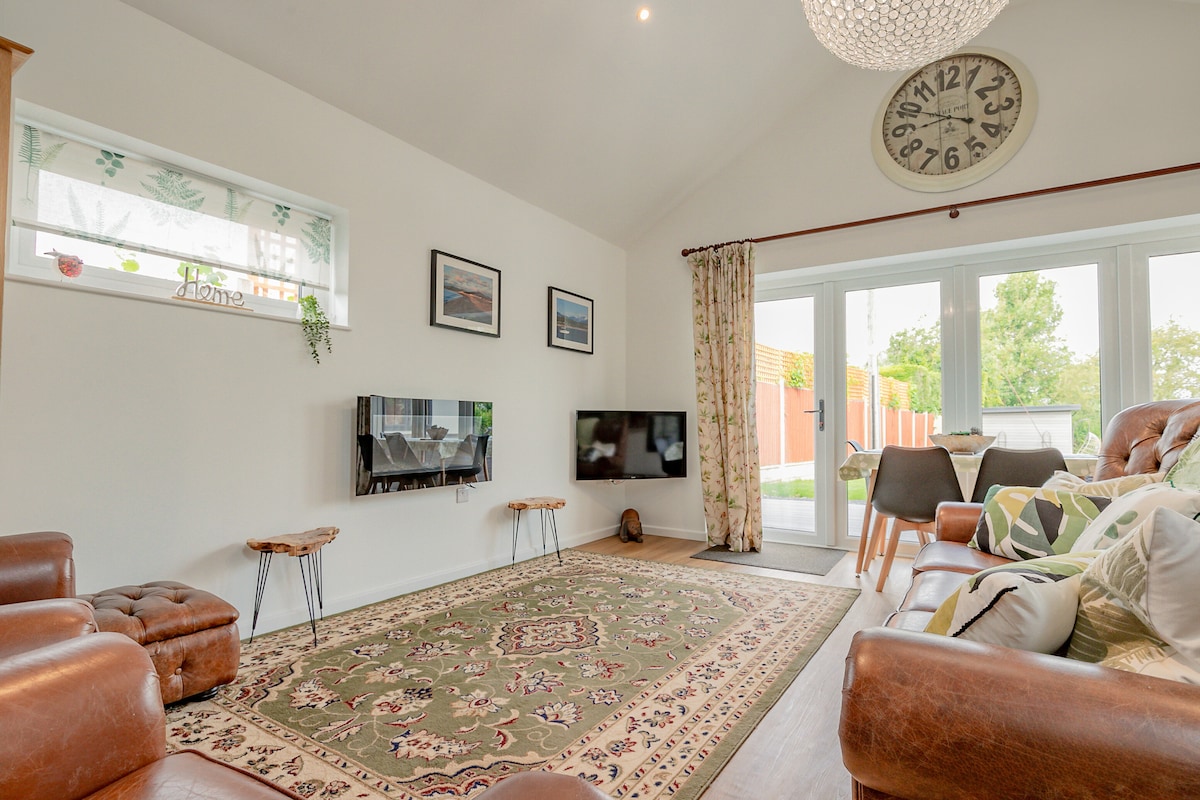 The spacious living area is the perfect spot to unwind, featuring a large sofa and two comfy armchairs by a bookshelf—ideal for settling in with a good book while enjoying the garden views. For entertainment, there’s also a Smart TV available.
