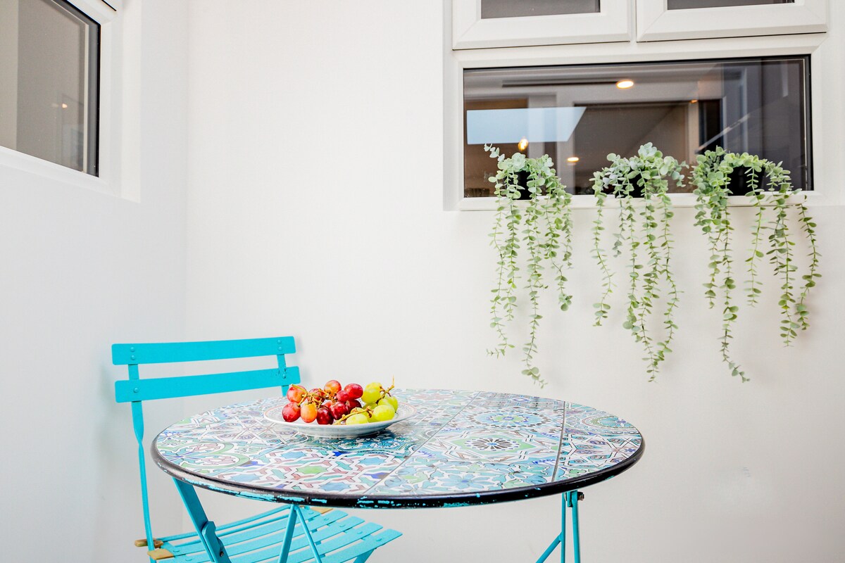 There is a unique light and bright covered space off the master bedroom with a table and chairs plus a dedicated working space with a desk.