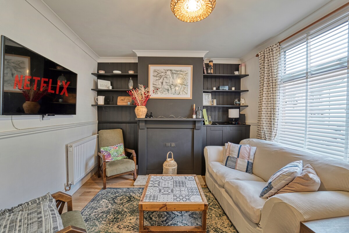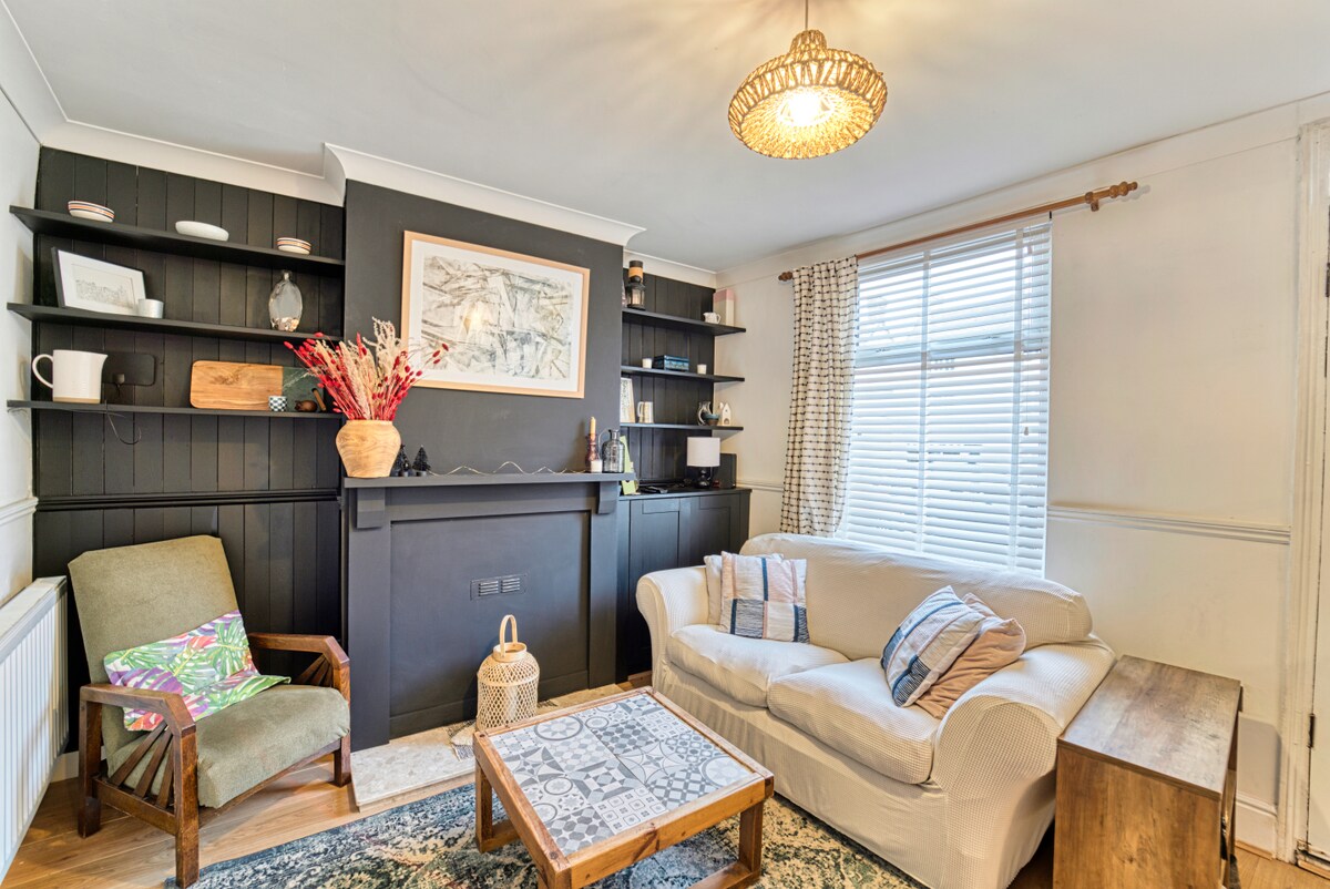 The cosy and stylish living area features a smart TV, a two-seater sofa, and two separate chairs, creating the perfect space to unwind after a day of exploring.