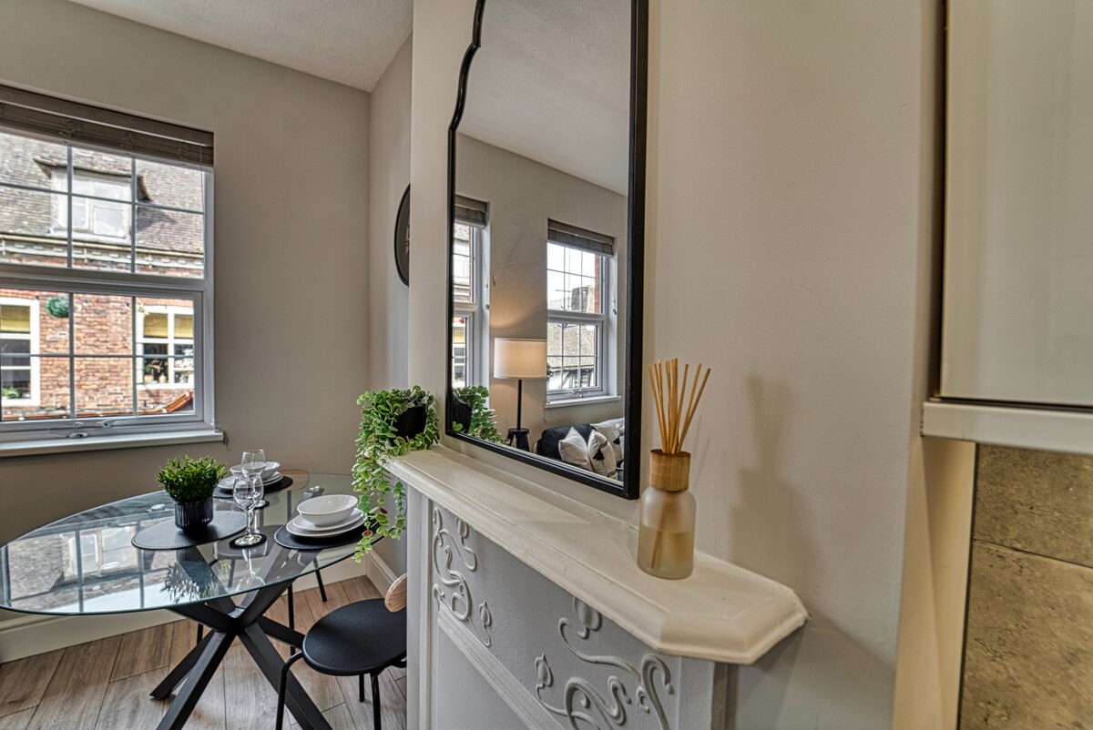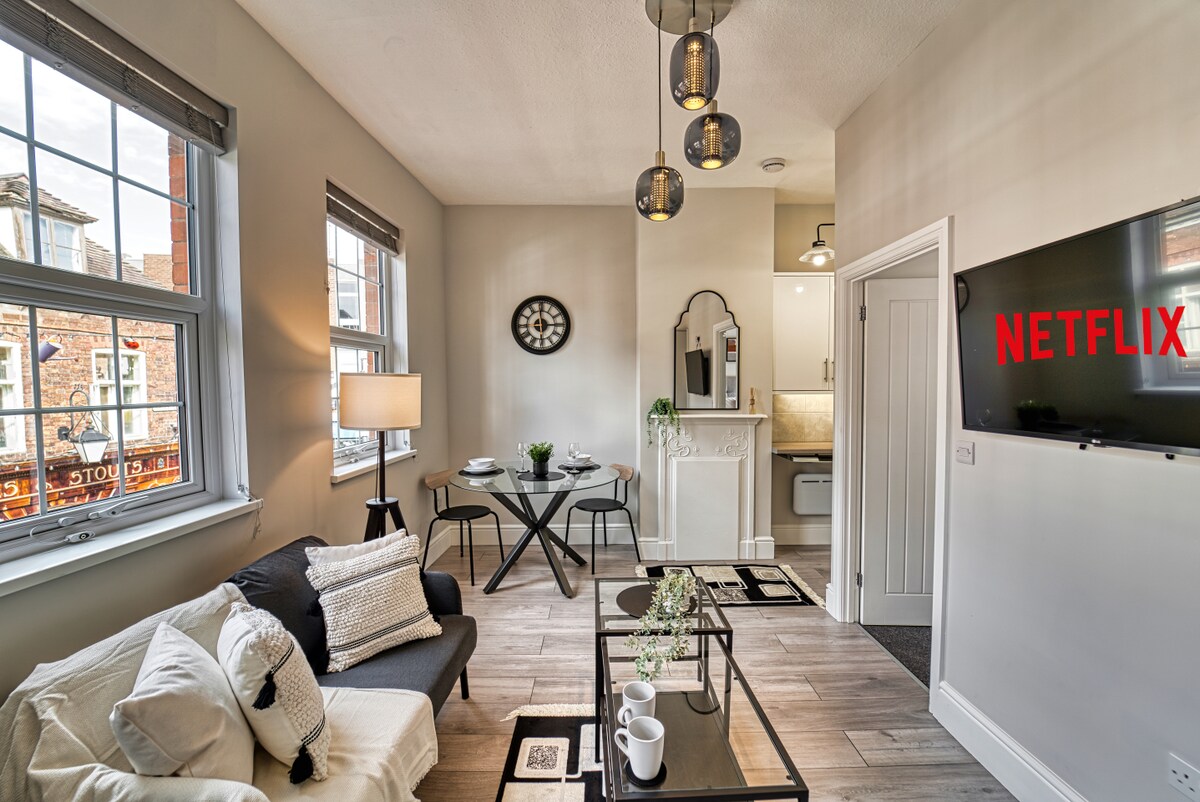 Located in the heart of Worcester, this apartment is the perfect base for a city break, offering easy access to a variety of restaurants, bars, and shops. You'll also be close to the city's rich history and cultural attractions. The property is situated above Taylor Bennett's, with the entrance located on the left side of the shop. Please note that guests will need to walk up one flight of stairs to access the apartment. While there is no parking on-site, you can find convenient parking at 'St Martin's Gate' car park, just a 5-minute walk away, or at the nearby 'Cornmarket' car park.The kitchen is fully equipped with everything you need for a self-catered stay, including complimentary tea and coffee to help you settle in. The living area offers a cozy space to relax, complete with a Netflix-ready Smart TV and a charming view overlooking the cobblestone street. The apartment features a small double bed in the bedroom, with fresh linens and towels provided for your comfort. The en-suite bathroom, attached to the main bedroom, includes a walk-in shower, perfect for refreshing after a day of exploring the city.