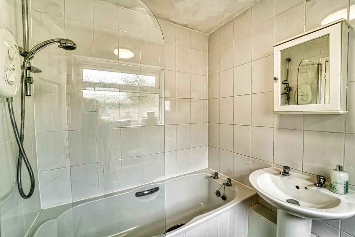 There are two bathrooms in the property. The main bathroom, located downstairs past the kitchen, features an over-the-bath shower, while the master bedroom has an en-suite with another over-the-bath shower. Towels and bed linen are provided for your stay.