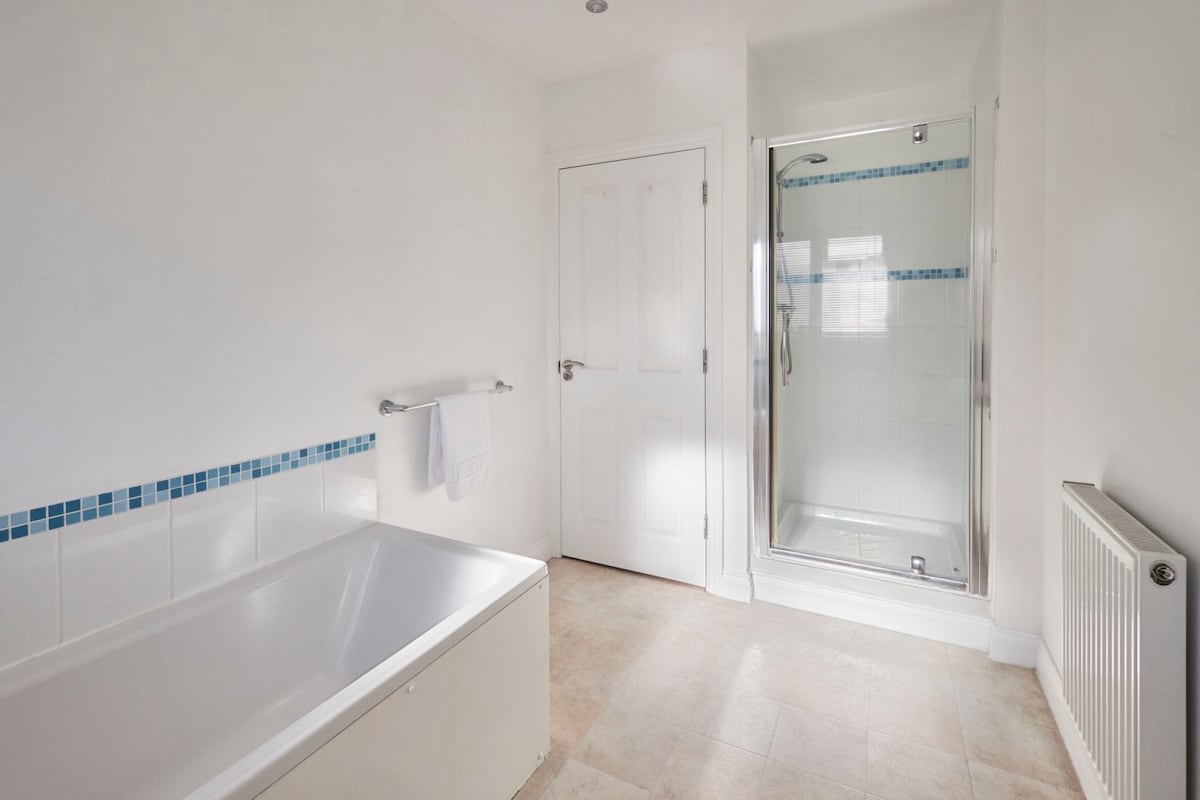The family bathroom includes a bathtub, separate walk-in shower, WC and basin. An ensuite shower room is also available in one of the first floor bedrooms.