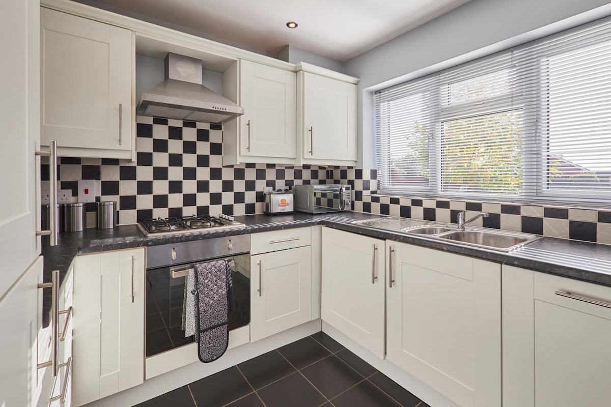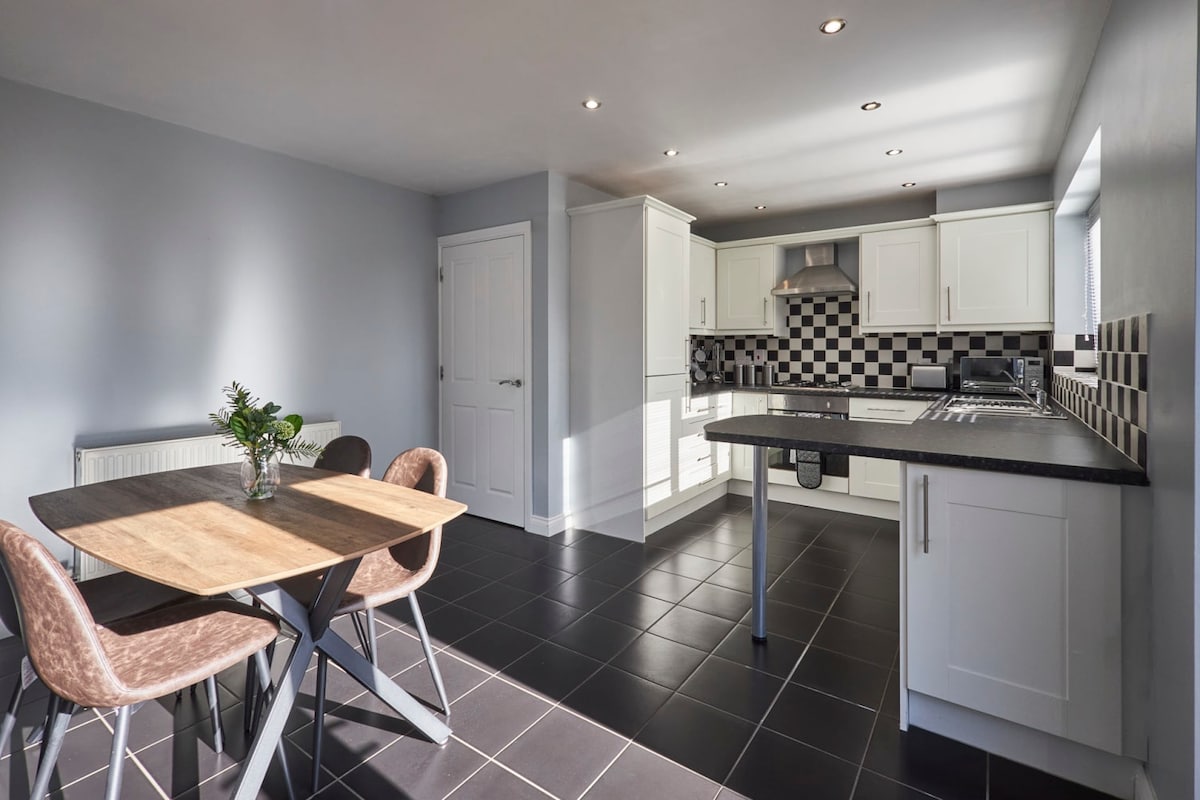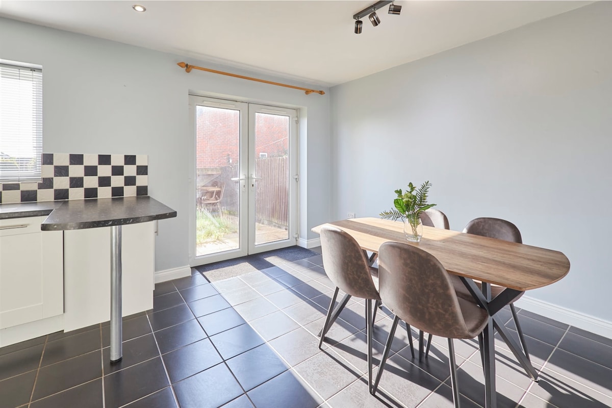 Tibshelf House has a stylish living room with a corner velvet sofa and a flat screen TV. The ideal place to relax after a busy day in Derbyshire, you can snuggle up on the sofa and keep up with your favourite shows on Freeview.Fully equipped for self-catering staycations, the kitchen has everything you could need to prepare meals easily. The dining area includes a wooden dining table with comfy seats.