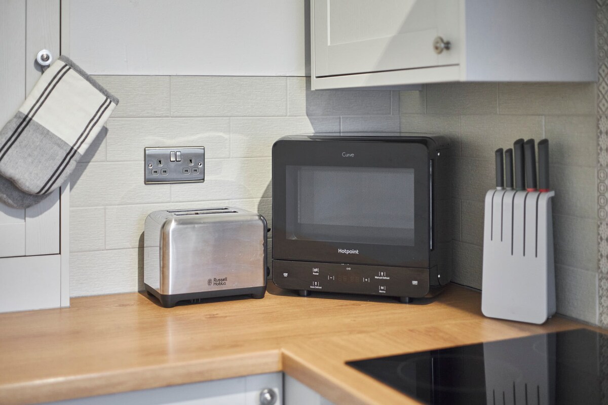 Dodds Lane has a bright and welcoming open plan living and dining area. With laminate flooring and light grey walls, the space is polished and stylish. When you want to relax, you can cosy up on the velvet sofa and get lost in a book or enjoy a home cooked meal in the dining area.The kitchen is equipped with modern appliances and cookware so you can make the most of your self-catering stay.