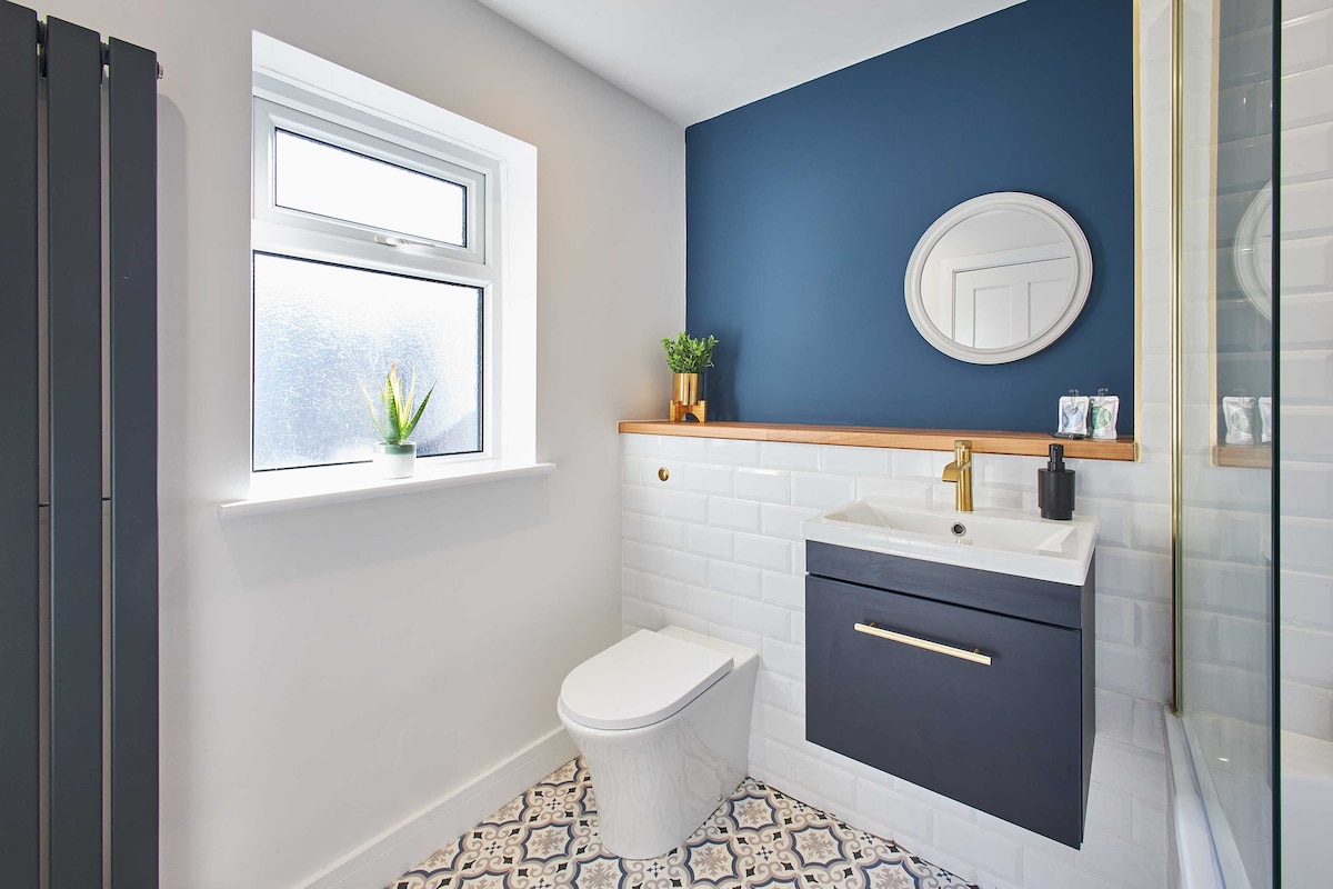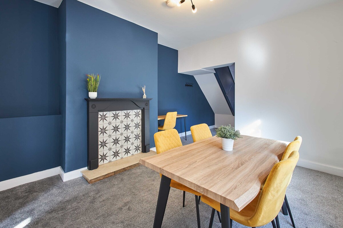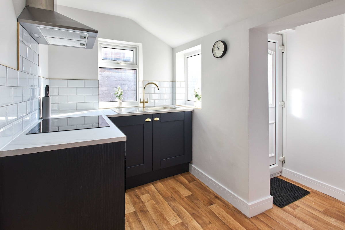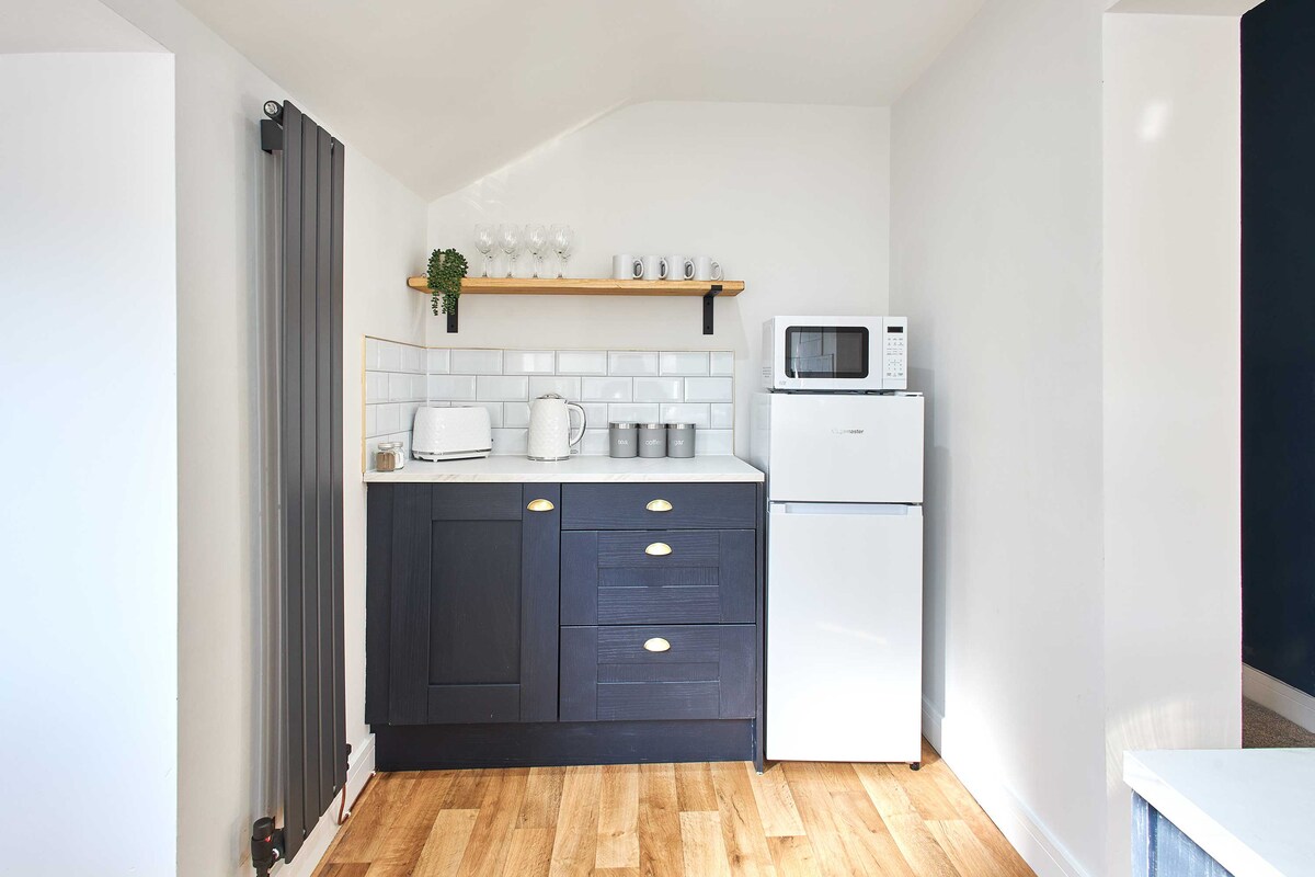 Ultra stylish, the kitchen features blue cabinets and smooth white worktops. Amenities include an oven, hob, microwave, toaster, kettle and fridge freezer so Anchor House is fully equipped for self-catering stays.