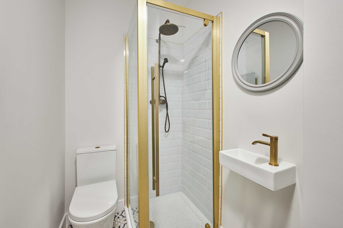 The bathroom on this floor has white tiles surrounding the shower, complemented with golden fittings. Modern and clean, there is a walk-in shower, WC and a wash basin. Another bathroom is available on the ground floor, and this space boasts a bathtub and overhead shower.