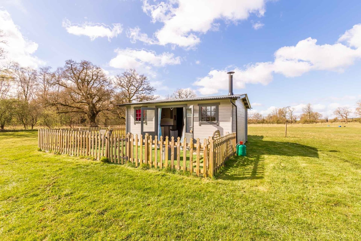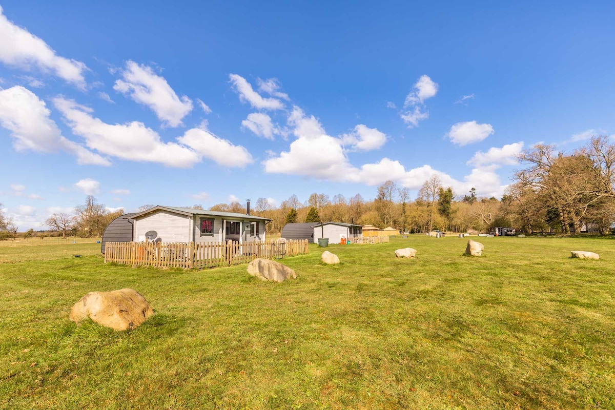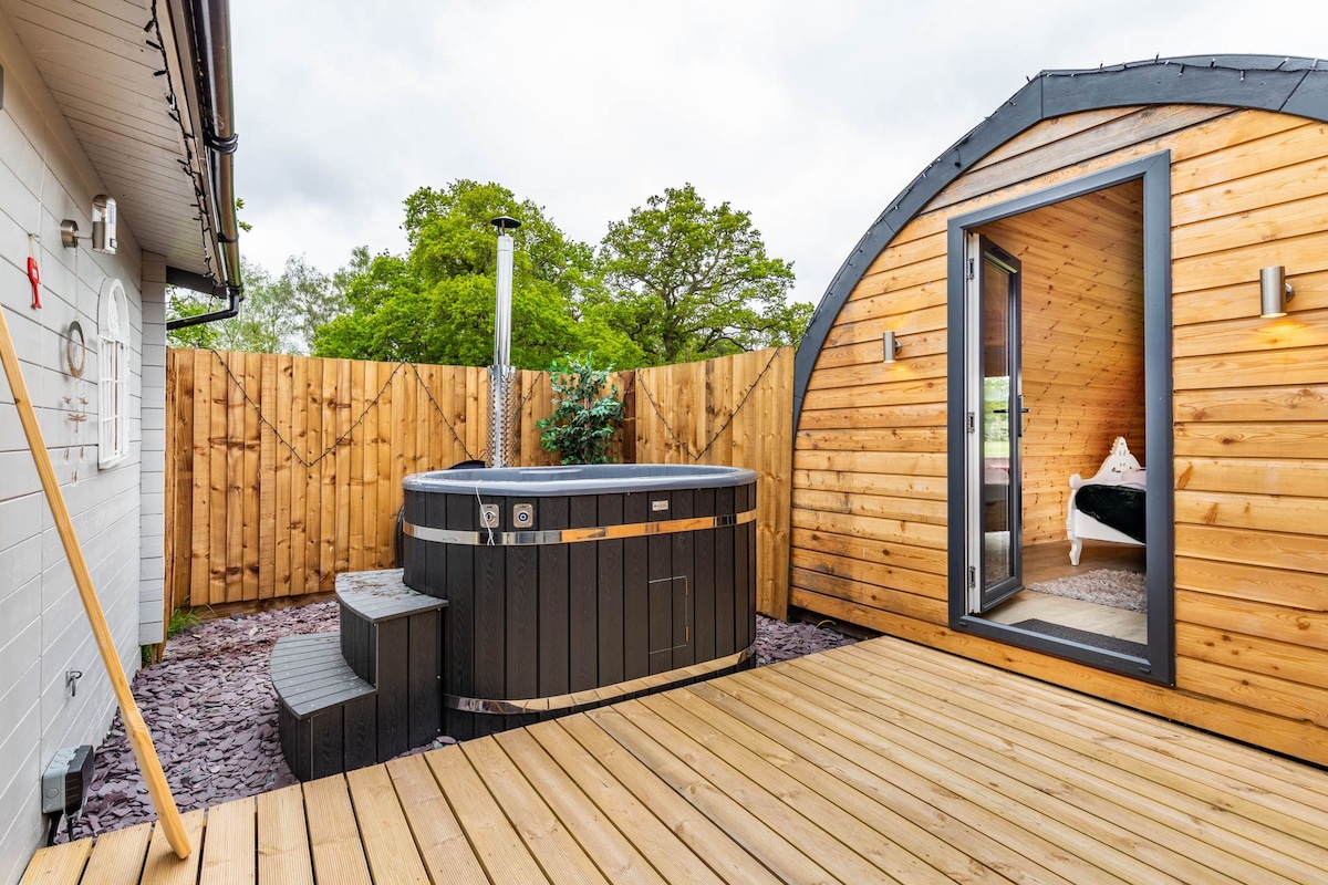 Nestled in open grassland, the Dragonfly Hybrid Pod boasts a charming fenced garden with outdoor seating, a gas firepit that also serves as a BBQ, and a private wood-fired hot tub and infrared sauna.The pod connects a cosy living area and kitchen to a spacious king-sized bedroom, featuring two sofas, a dining table, and a wood burner, elevating your glamping experience.