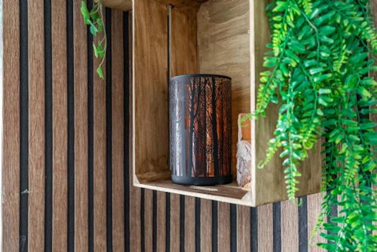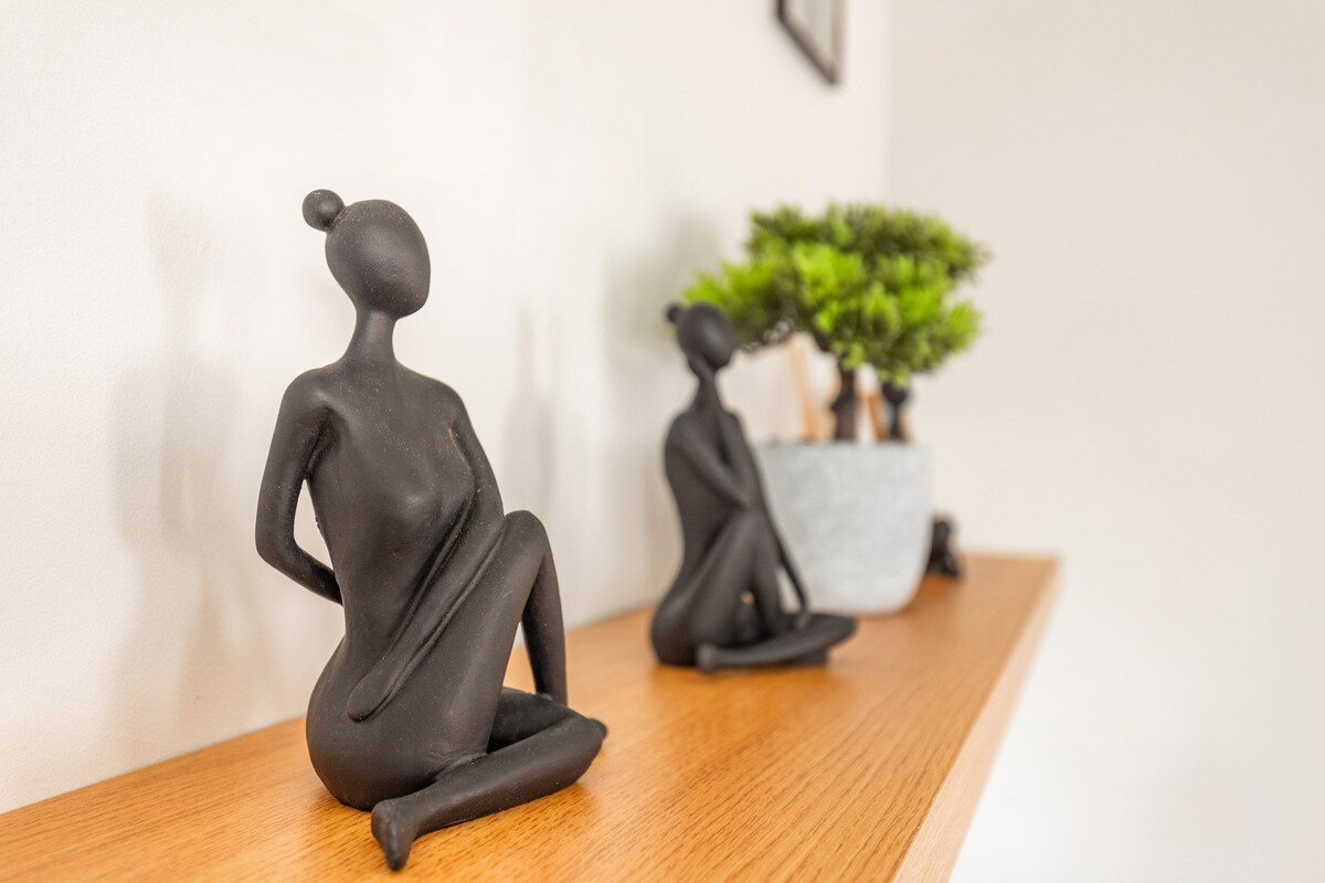 Angel Apartment offers a cosy and inviting double bedroom, complete with two bedside lamps, wooden shelving for storage, and chic décor to ensure a restful night’s sleep.The bathroom features a bathtub with a shower unit, sink, and a sleek black wooden bath tray, ideal for a relaxing soak after a day of exploring Norwich.