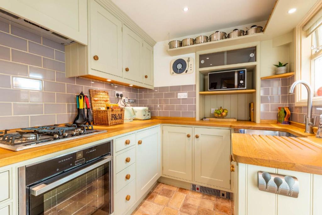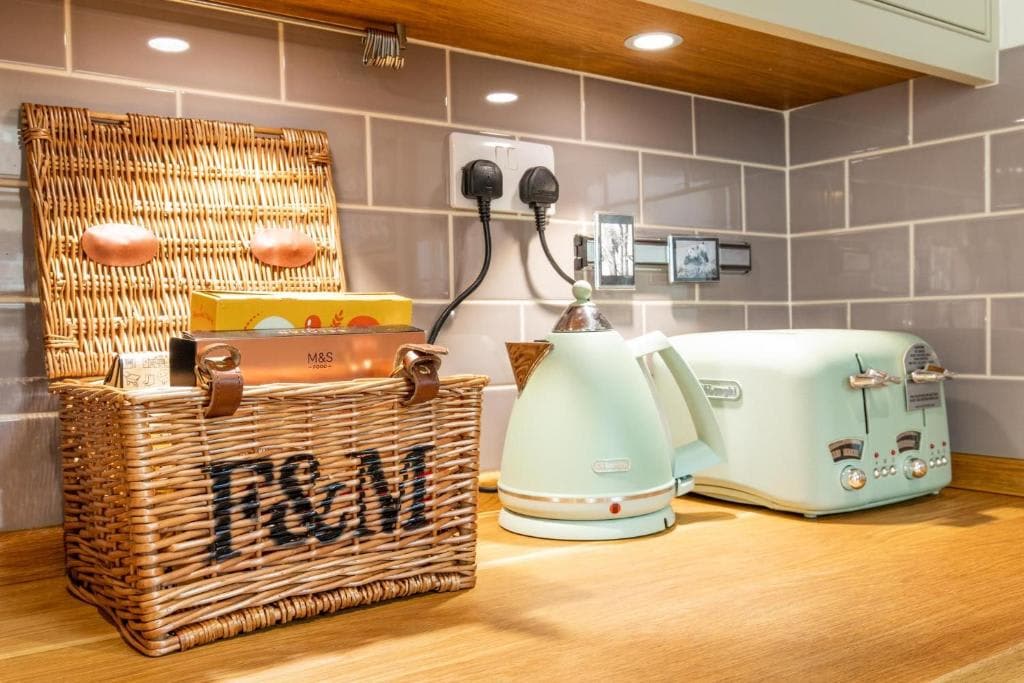 Unwind in the cosy living room with two sofas, a wall-mounted TV, and a log burner for chilly evenings.The fully equipped kitchen includes a fridge, freezer, oven, hob, dishwasher, washing machine, and a cafetiere for fresh coffee. The extendable dining table comfortably seats the full occupancy.