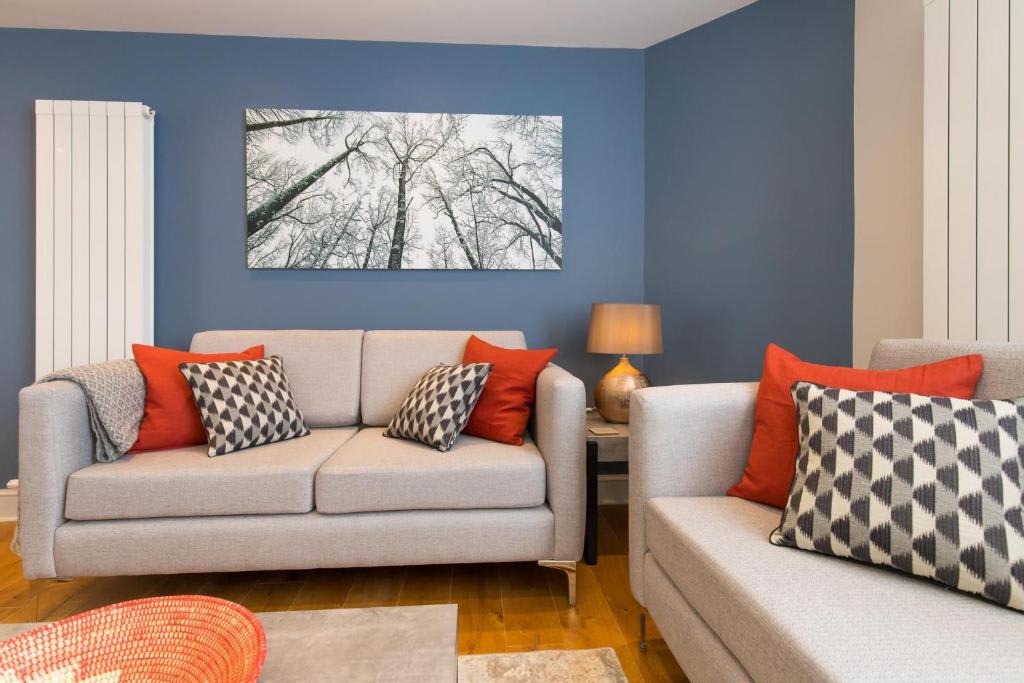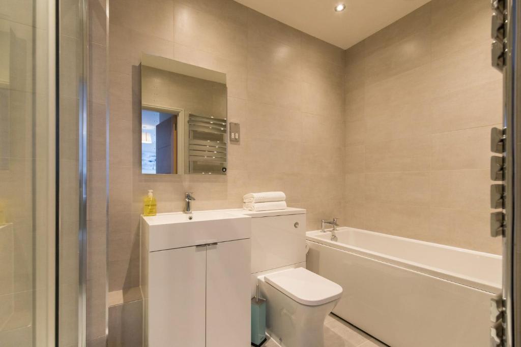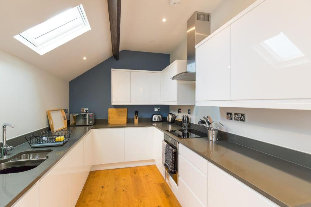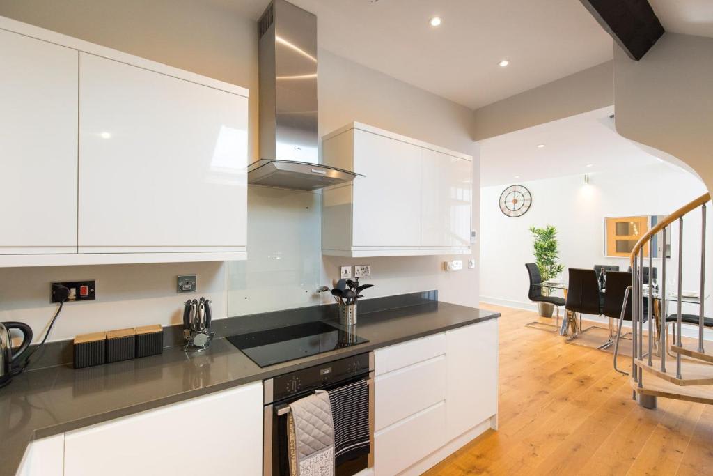 The fully equipped kitchen includes a fridge, freezer, oven, induction hob, dishwasher, toaster, kettle, pod coffee machine, and microwave. A washer dryer is available in the downstairs utility room.