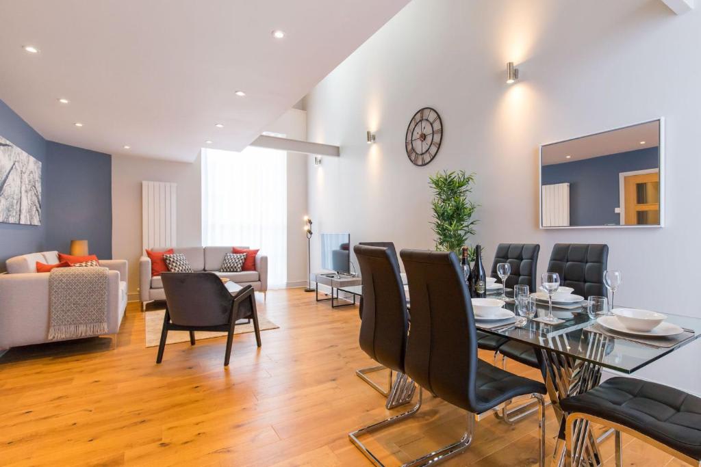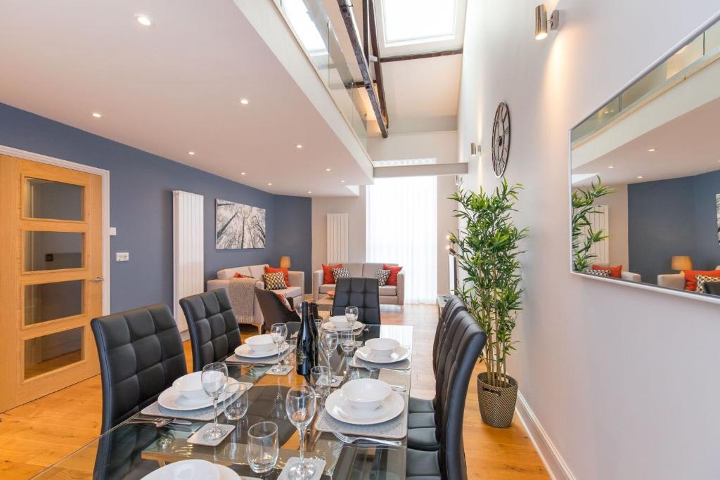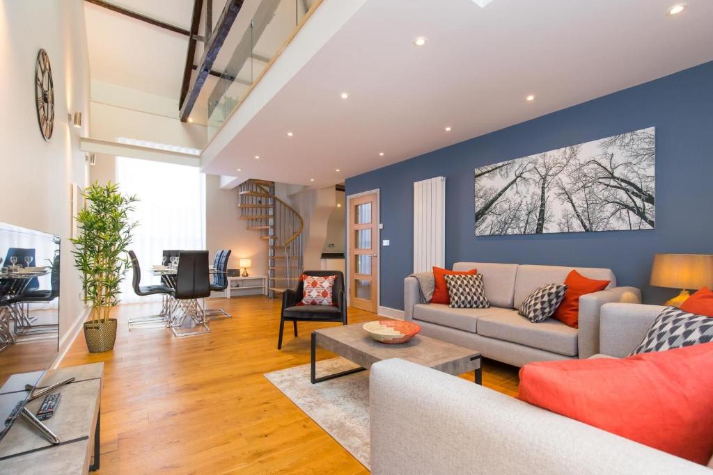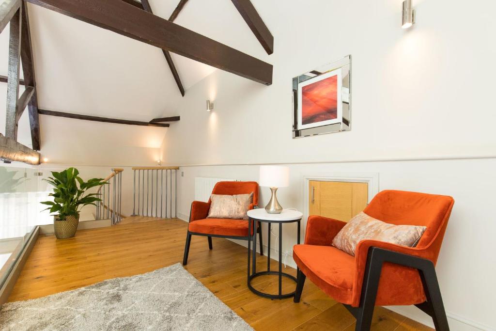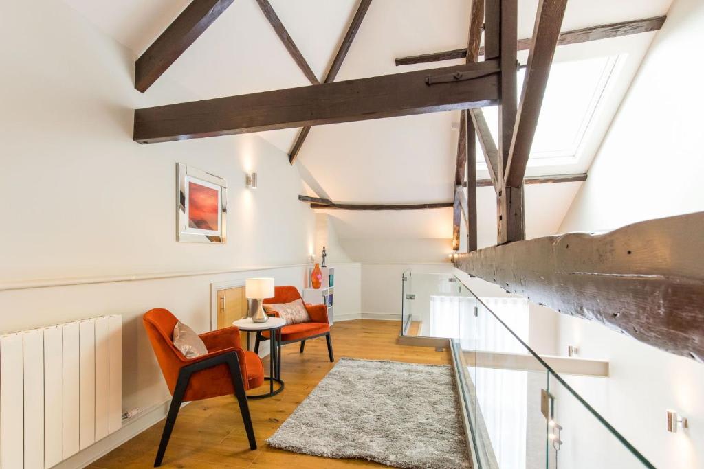 The first floor has an open-plan living area with two comfy sofas, a smart TV, and a large dining table for six. A mezzanine snug, accessible via a winding staircase, offers a quiet space for reading or coffee. Board games and books are also available.