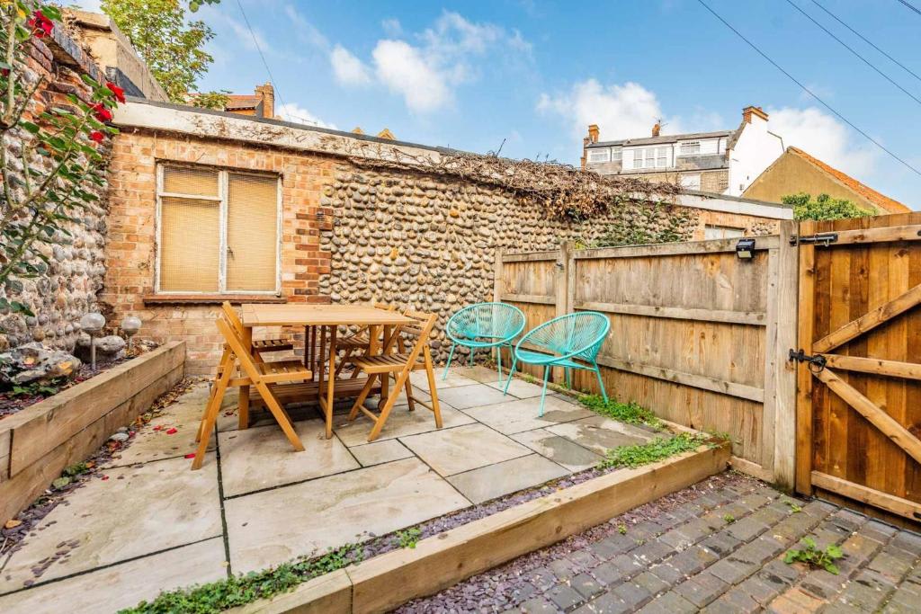 A courtyard with seating, accessible via stairs from the kitchen, provides a relaxing outdoor space.
