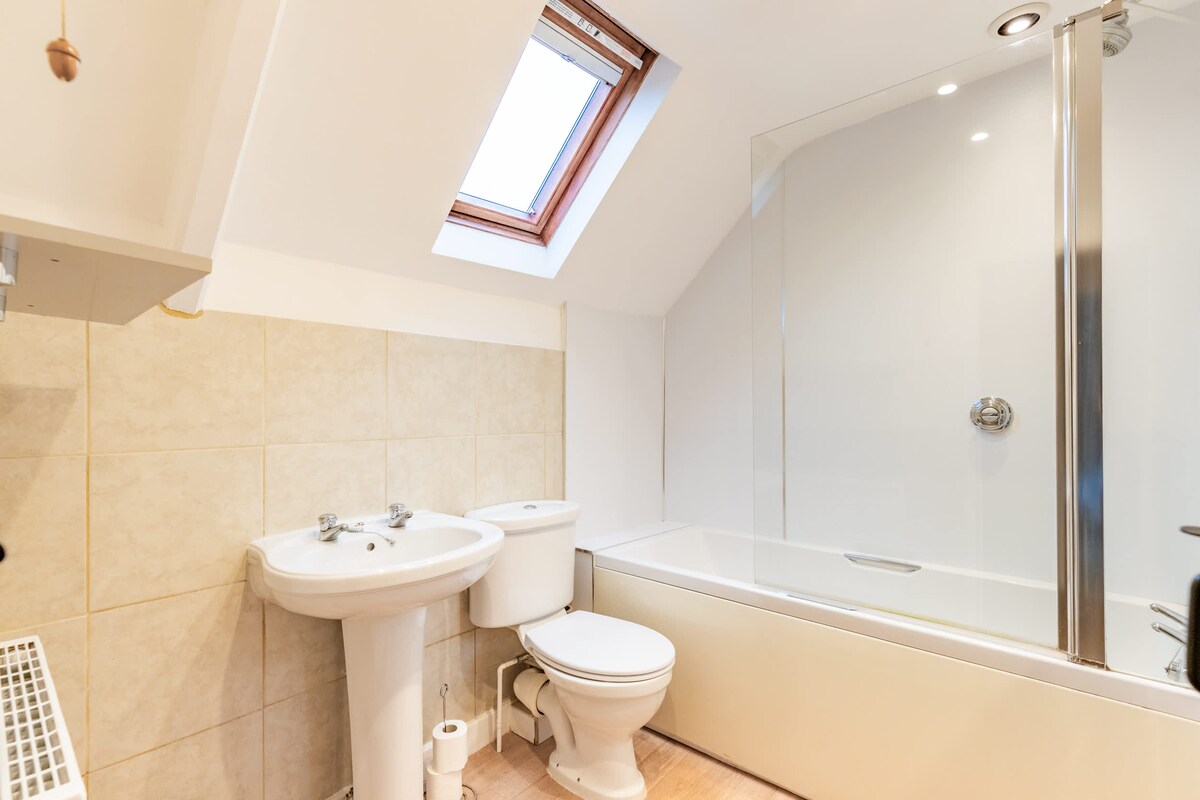 The cottage boasts two bathrooms for your convenience. The upstairs family bathroom features a shower over the bath, a toilet and sink, as well as a charming skylight. Downstairs, you'll find a second bathroom with a standalone shower.