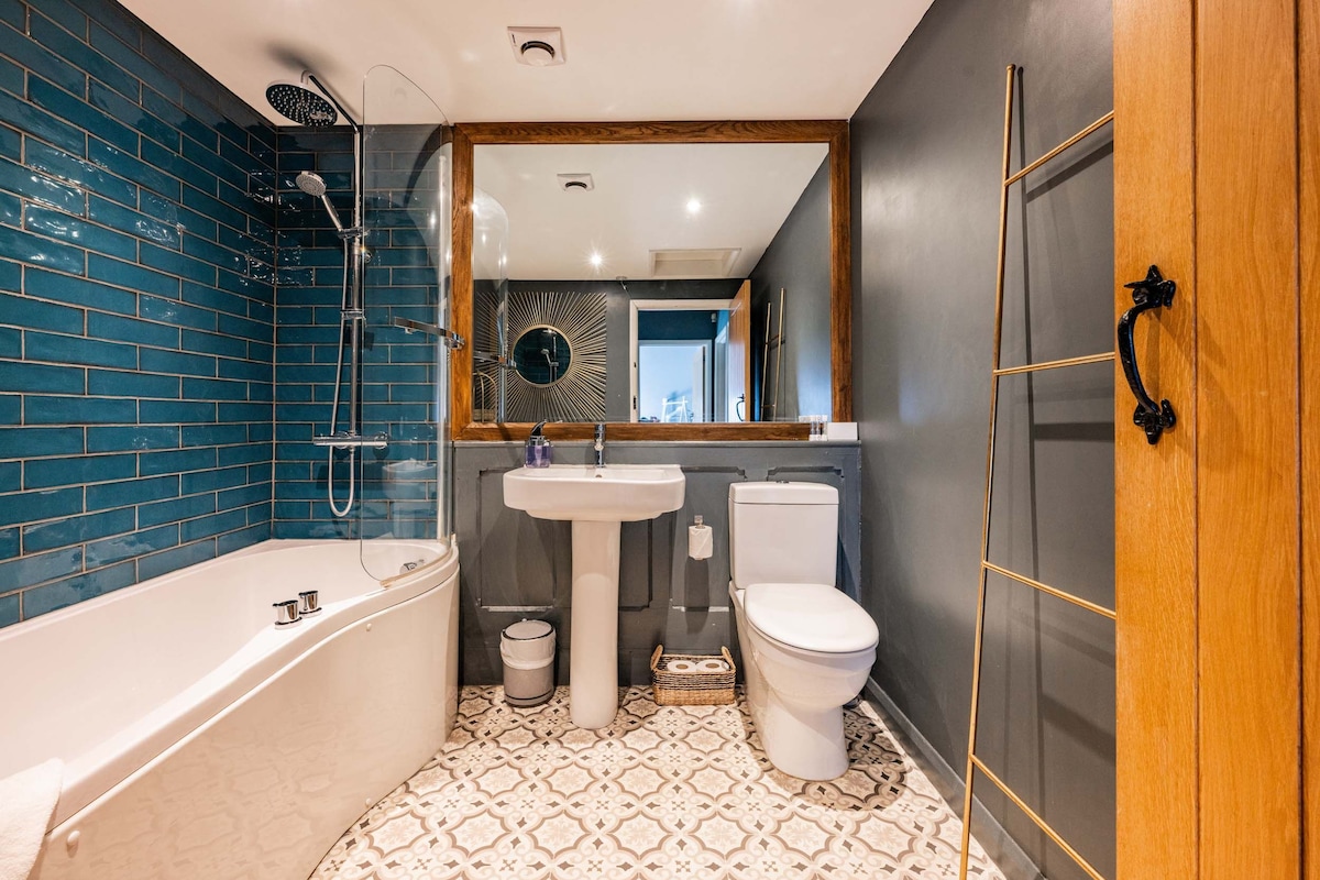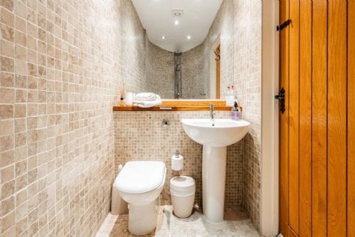 There are two bathrooms: a ground-floor wet room with a WC, and a spacious upstairs family bathroom with a rainfall shower over the bath, wash basin, and toilet. Fresh towels are provided.