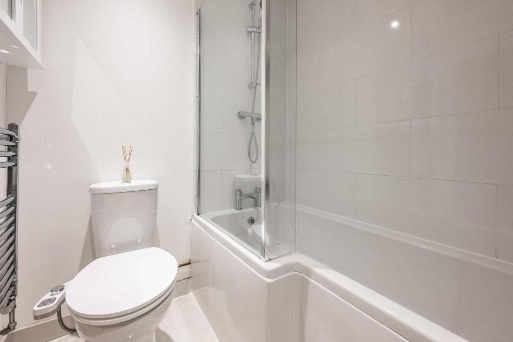 The modern bathroom includes a shower, bidet, toilet, and wash basin, with fresh towels provided.