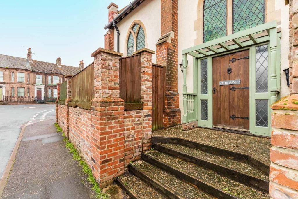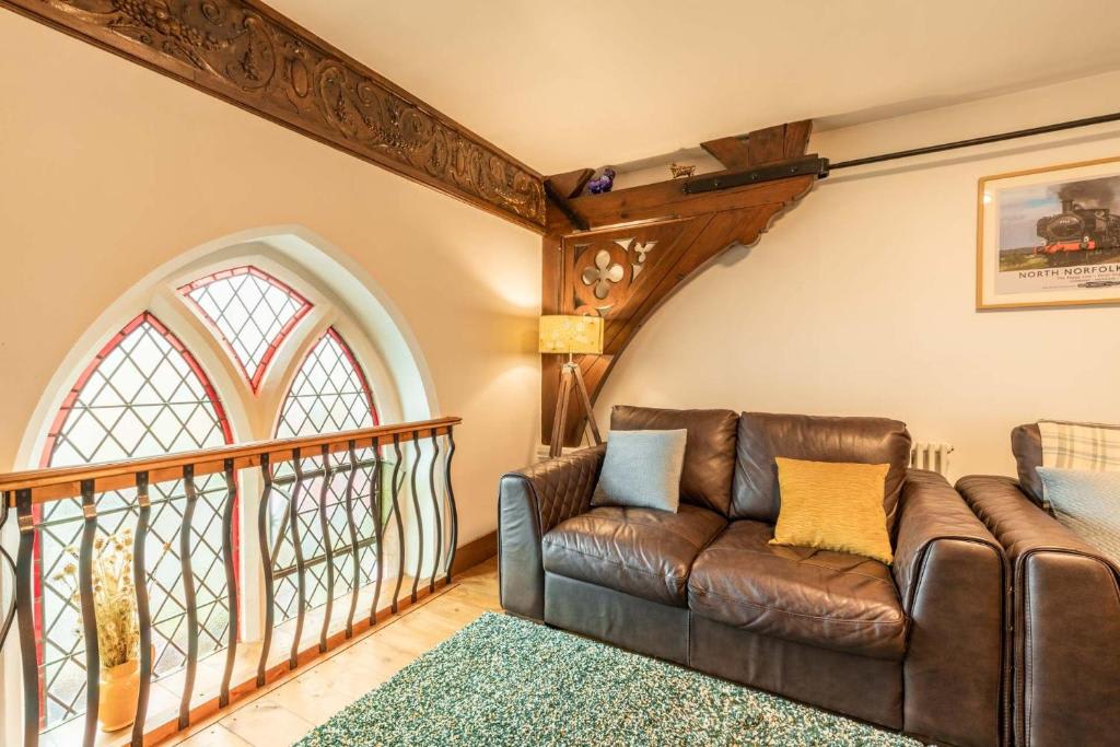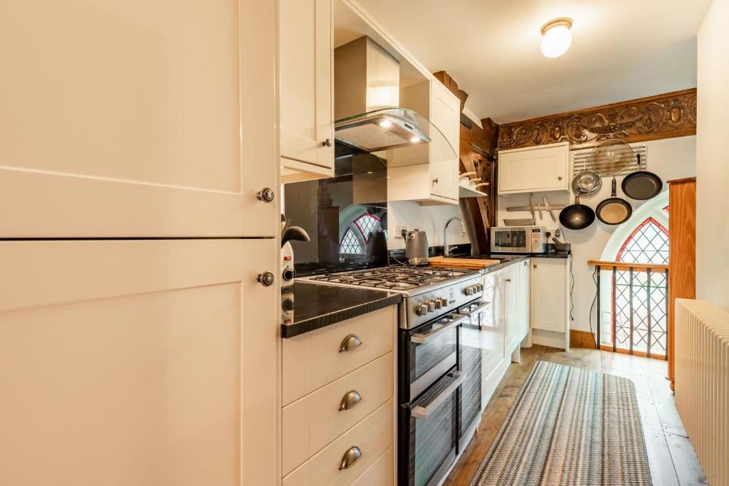 The Nave spans three floors and includes two bedrooms, a kitchen, living room, two bathrooms, and an office space with a desk.The property has been modernised for comfort while preserving its historical charm, featuring stained-glass windows, curved wooden beams, and beautiful hardwood floors.
