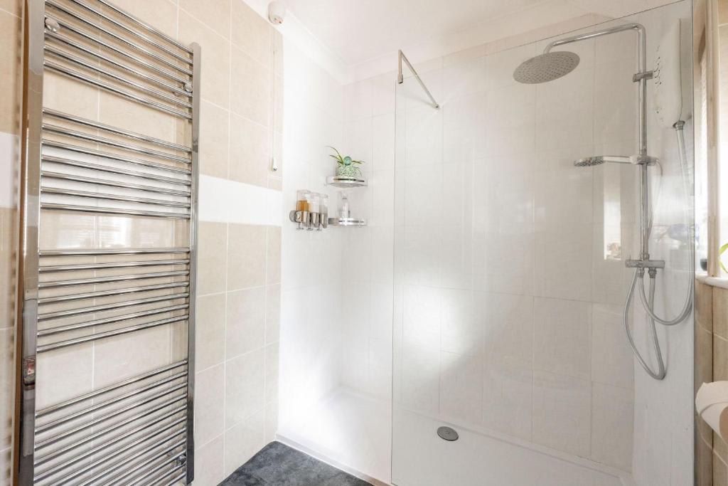 The modern bathroom features a spacious rainfall shower and fresh towels, with an additional ground-floor WC for convenience.