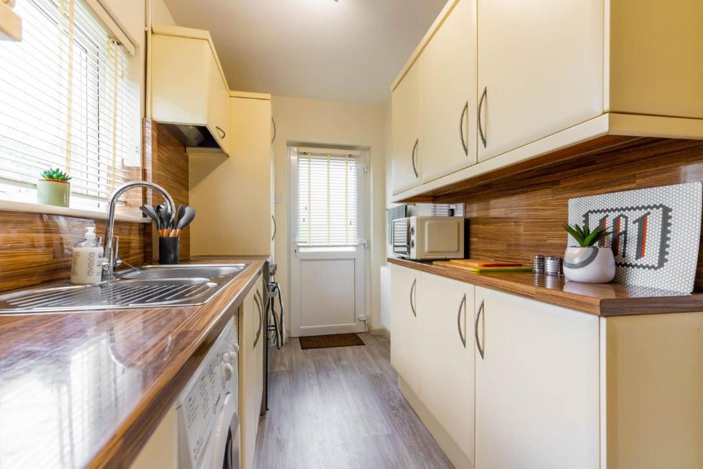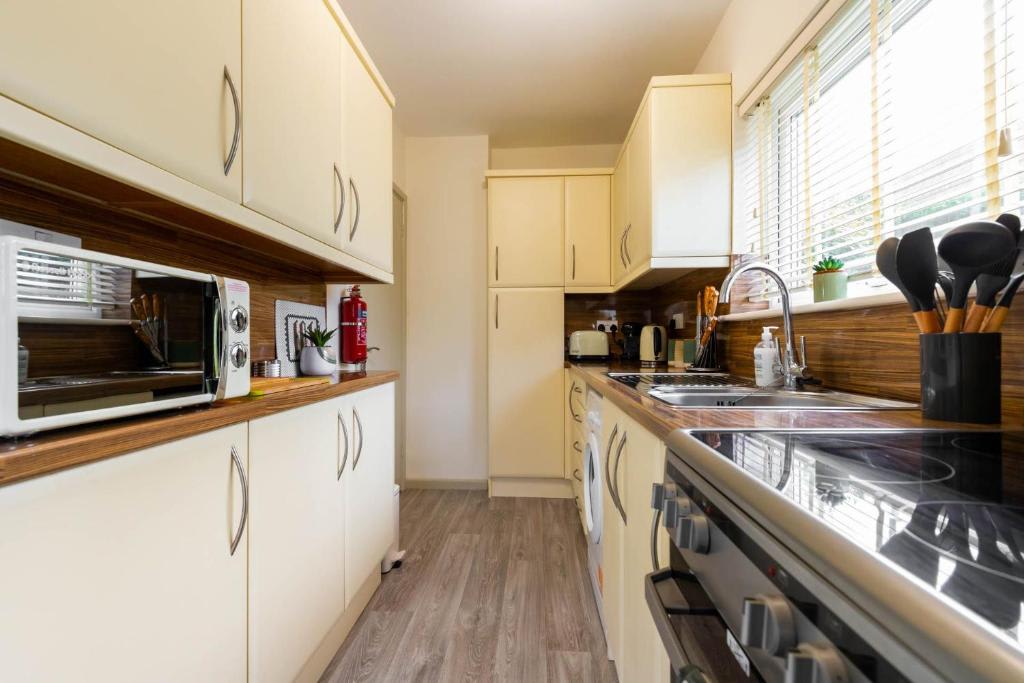 The fully equipped kitchen includes an oven, hob, microwave, fridge with freezer compartment, toaster, and all the cookware and utensils you’ll need, plus a washing machine.