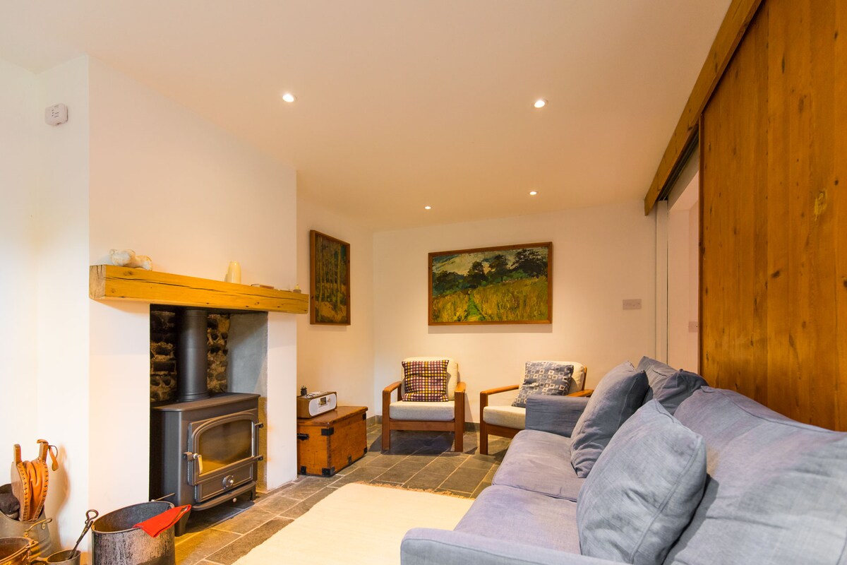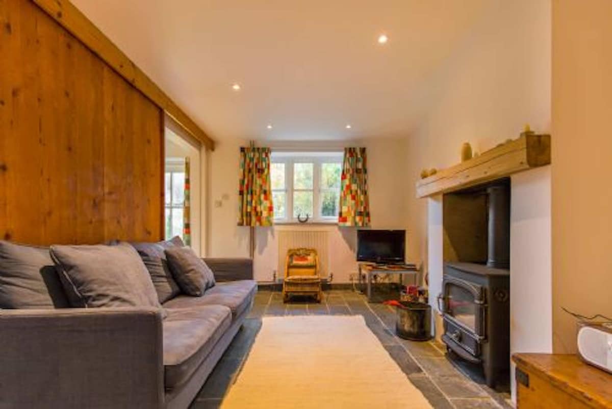The cosy lounge at the back of the cottage has a comfy sofa, two chairs, a Smart TV, and a stereo. Warm up by the wood burner on cooler nights.The front kitchen and dining area are fully equipped with a fridge, freezer compartment, electric oven, gas hob, dishwasher, and small appliances like a microwave and kettle. Perfect for family meals or packing up for beach trips.