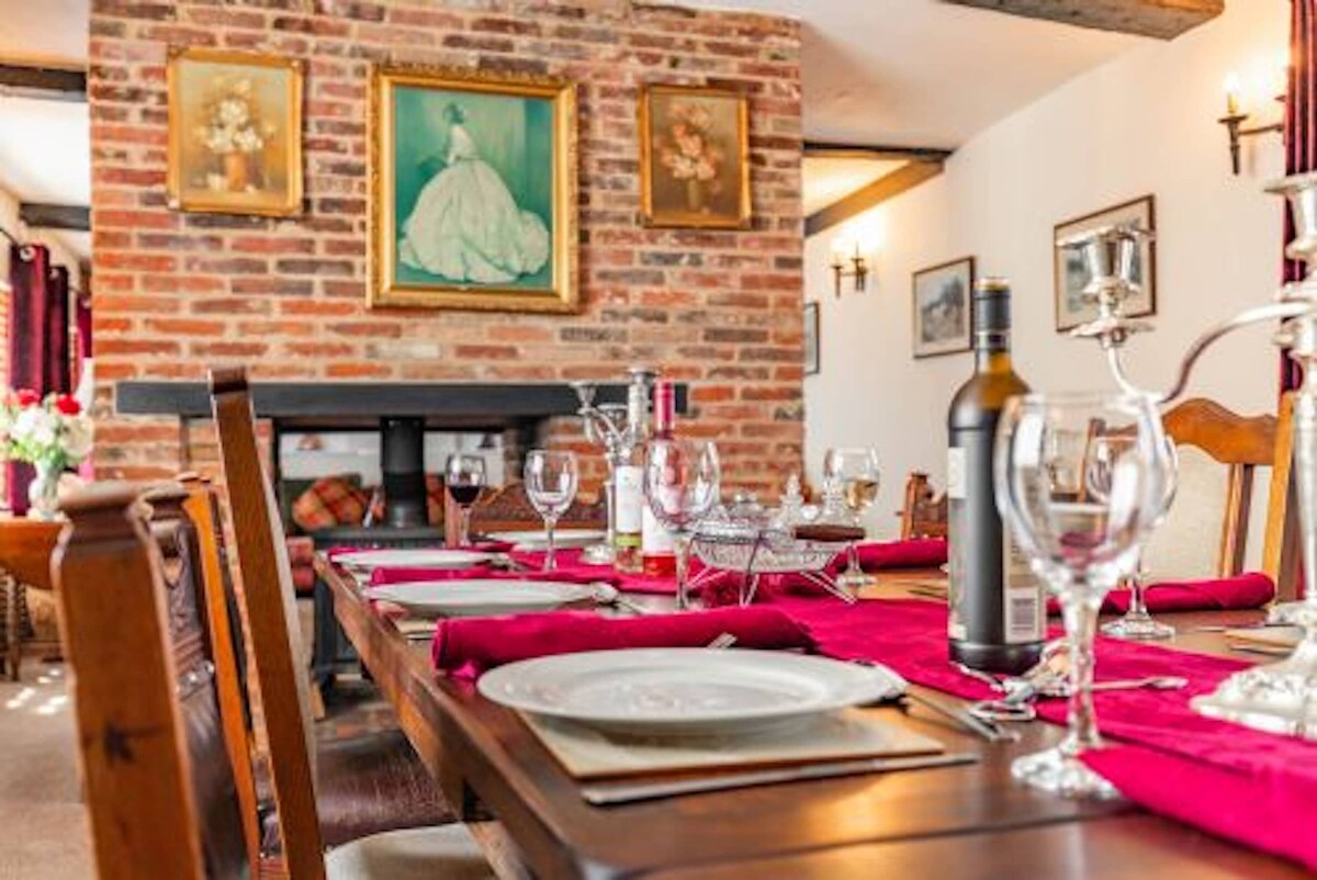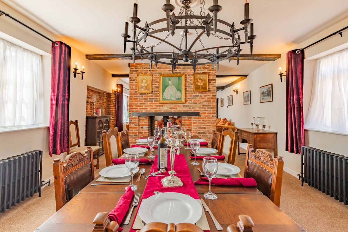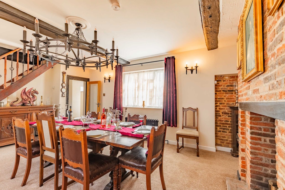 The elegant dining room features a long wooden table by a charming brick fireplace, adorned with a chandelier, creating a lovely setting for memorable meals.